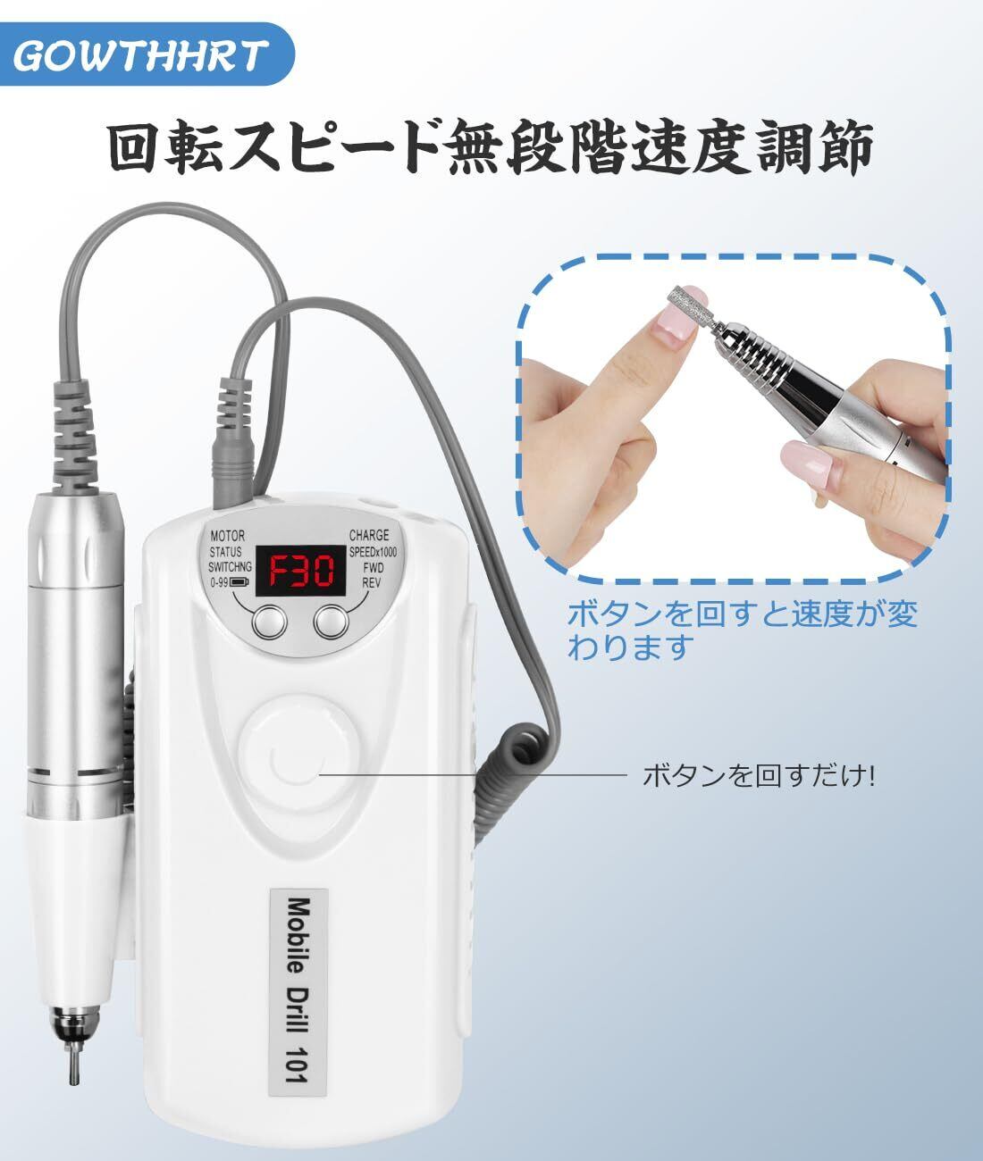 【無段階速度調節・正逆回転機能付き】GOWTHHRT電動ネイルドリルは、 1分間の回転数が0~30000の無段階速度調整が可能です。なお、左右どちらの手で持っても回転方向をあわせることができるため、利き手以外の手でもスムーズに作業ができますよ。