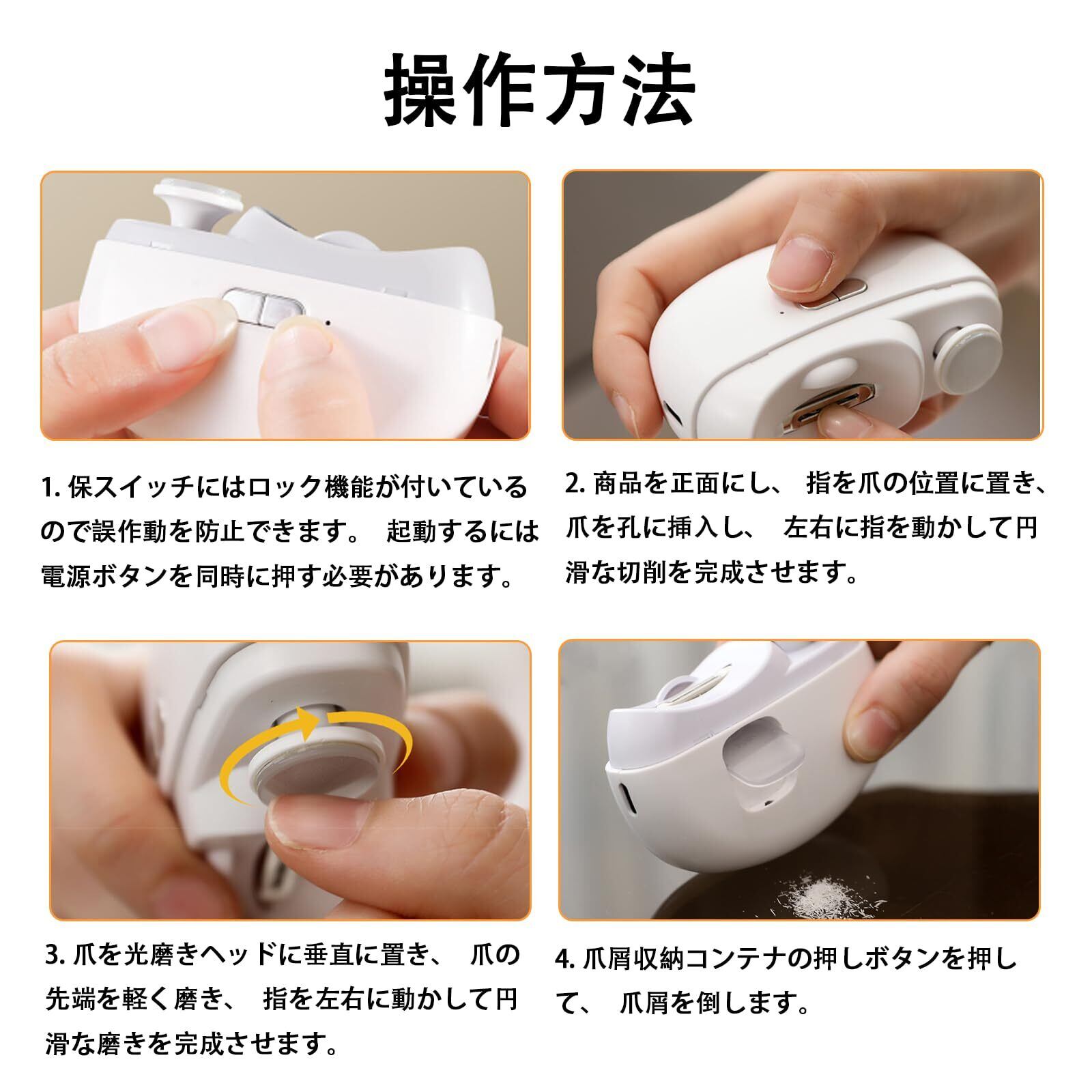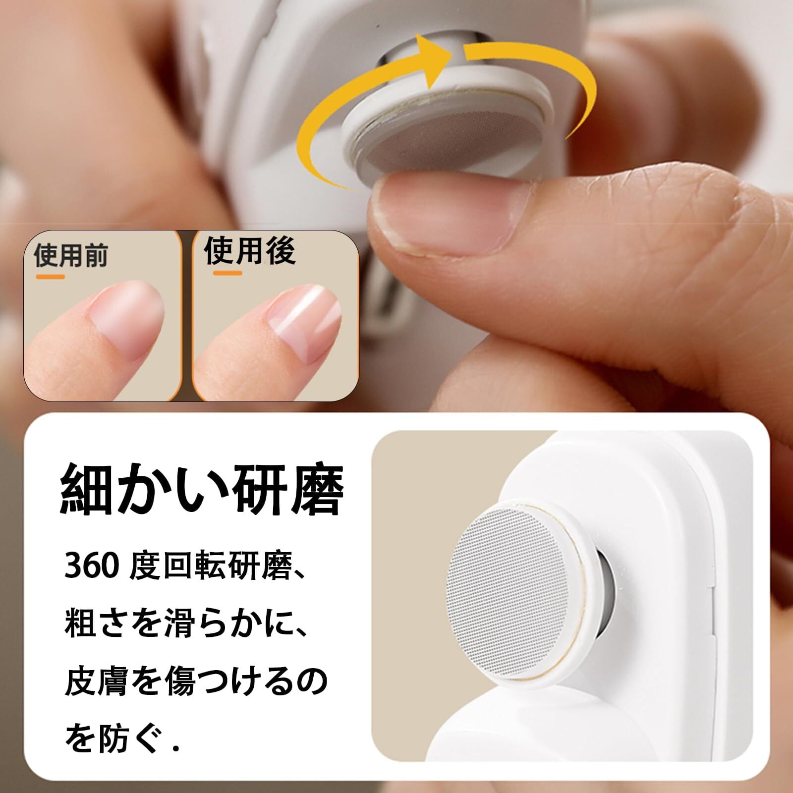 【LEDライト&低騒音設計】電動爪削りは低騒音設計を採用しており、赤ちゃんが静かに寝ている夜に使用しても、赤ちゃんを起こす心配はありません。また電動つめきり削りにはLEDライトが搭載されており、手を明るく照らすことができます、爪を切る際にトリミングをよりはっきりと見ることができます。