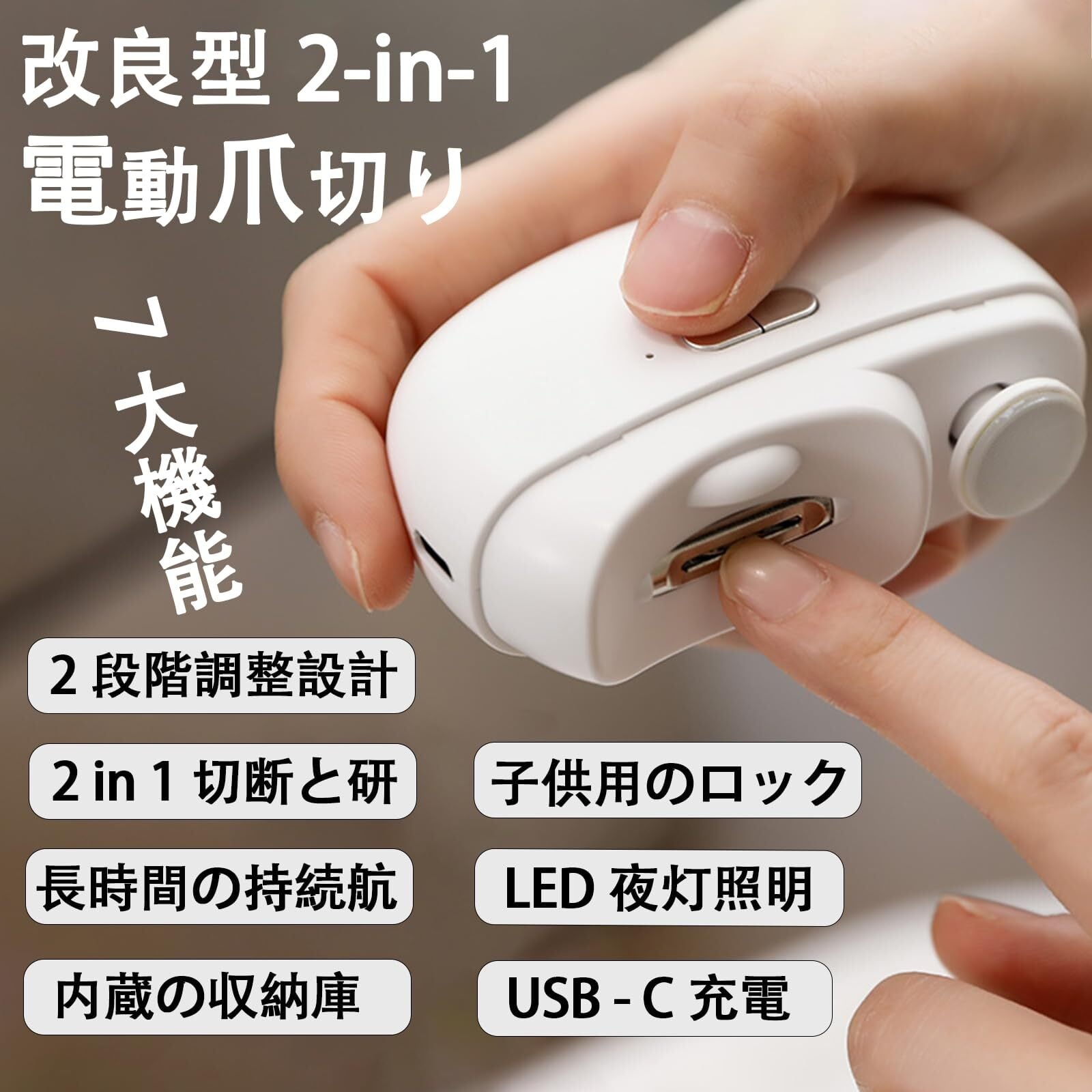 【2024年強化版】電動爪切り 2in1 両用 電動つめきり 深爪防止 爪切り 電動爪削り、Type-C充電式 低騒音 LEDライト付き 2段階スピード、 安全 介護用/高齢者/子供 簡単操作 高級 可愛い プレゼント ブラシ付き (ホワイト)