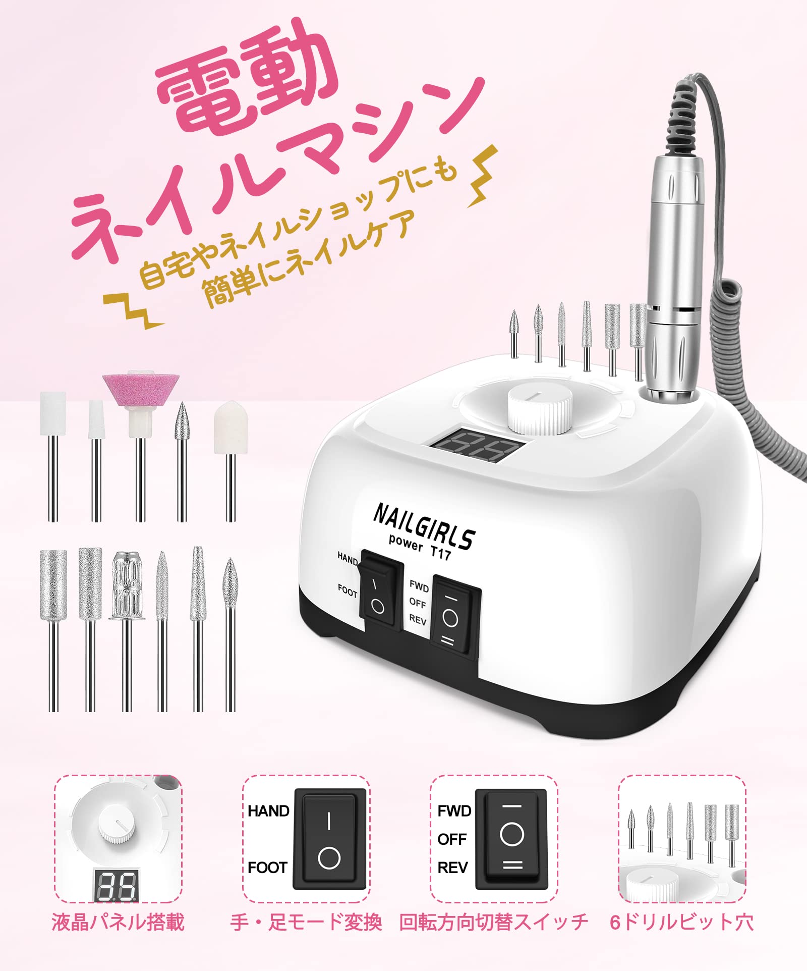 NAILGIRLS 電動ネイルマシン 11個のビット ネイルマシン 卓上式 電動ネイルケアキット ネイルケア ジェルネイルケア オフ ネイルドリルマシン 研磨 爪磨き 甘皮処理 角質除去 正逆回転 低振動 マニキュア対応 無段階変速 手足両用 35000rpm最大 自宅サロン用