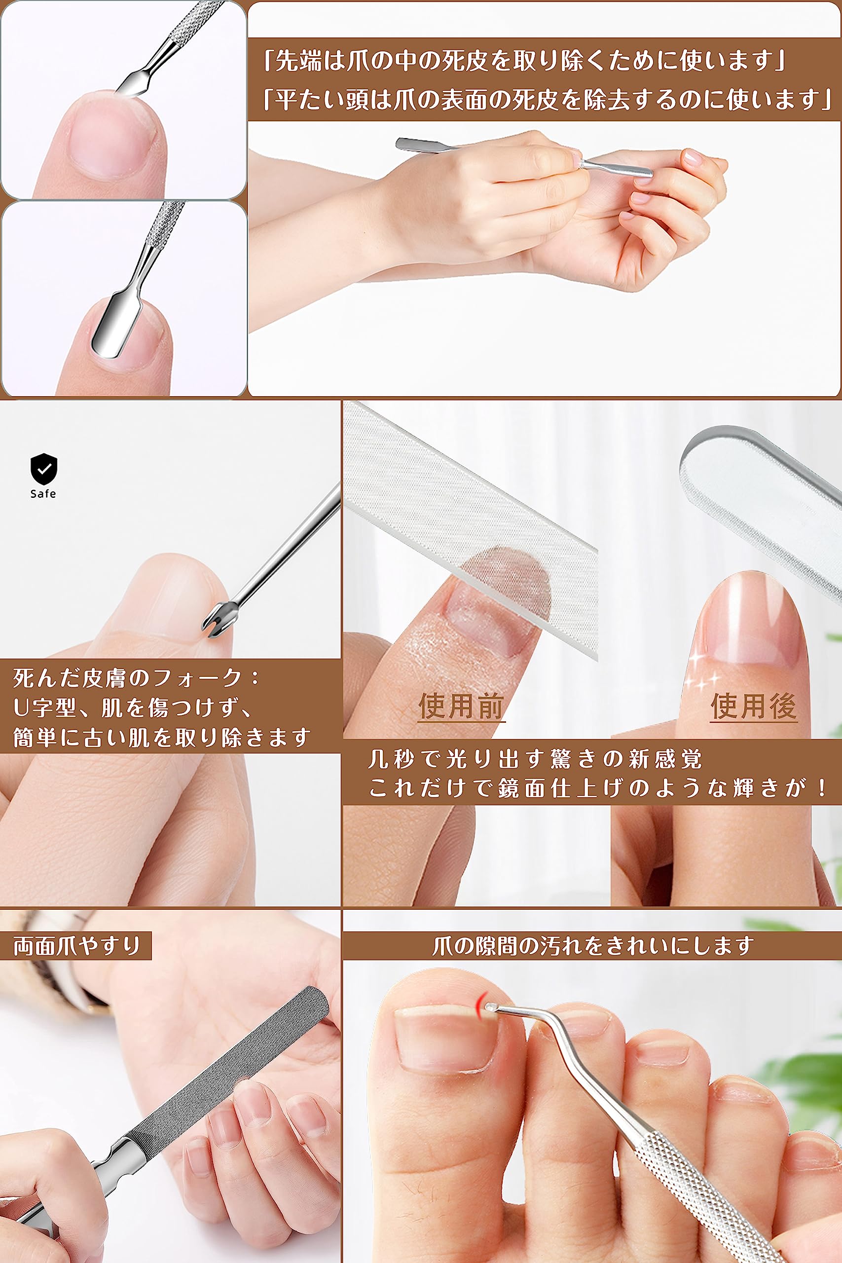 ??【新しいアップグレード・セット】セット内容:①高級爪切りニッパー②ダブルエンド・キューティクルプッシャー:先端は爪の中の死皮を取り除くために使います。平たい頭は爪の表面の死皮を除去するのに使います。③ ダブルエンド・ネイルクリーナー:爪の隙間の汚れをきれいにします。④ネイルデッドスキンフォーク:爪の左右の角質を取り除く。⑤ナノ爪やすり:サロン級の 艶 出しだけでなく、爪の先端を整えるなど爪ヤスリとしてもご利用いただけます。⑥両面爪やすり:爪磨きの