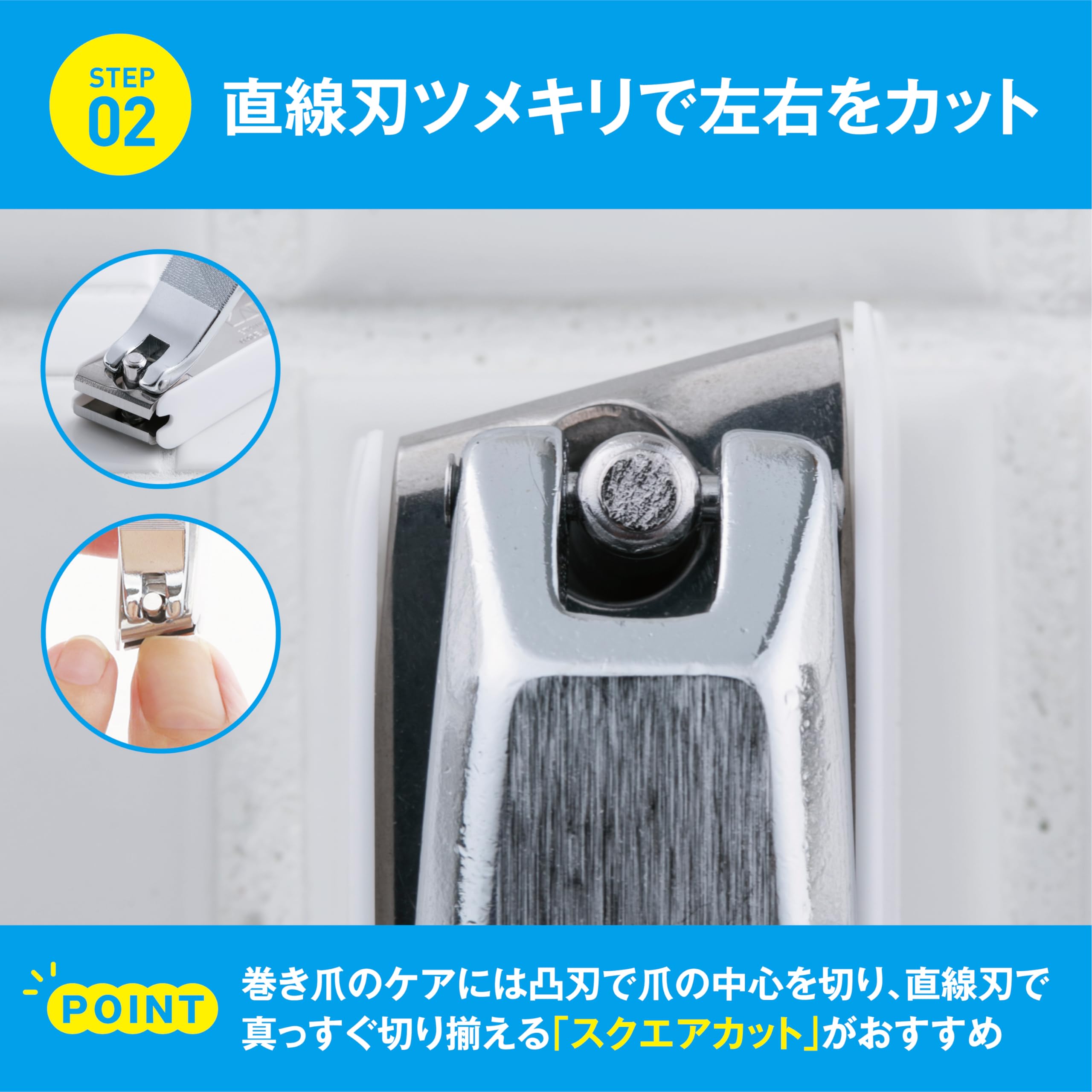 巻き爪は、スクエアの形にカットするのが理想的です。切り込みやすい凸刃と直線刃の2種類の爪切りで中央と左右の爪を切り整えて、爪やすりで仕上げを行い、段階的にケア。美しく理想的なスクエアカットを叶えます。