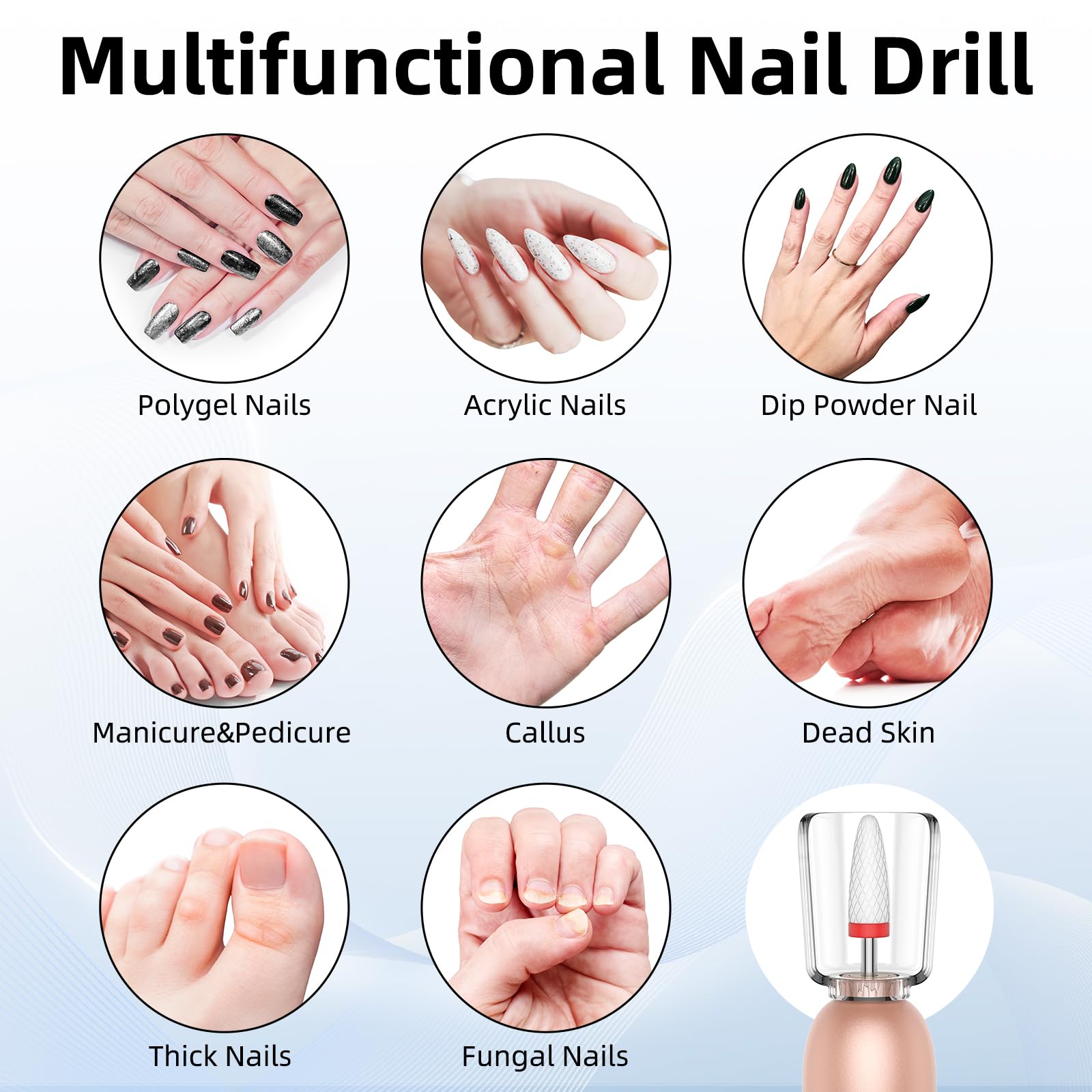 多機能ネイルドリルセット: ネイルドリルセットには、電動ネイルドリル、ネイルドリルビット6本、USBケーブル(アダプターは付属していません)が含まれています。アクリルネイル、ジェルネイル、ナチュラルネイルに適しており、あらゆるネイルアート効果を実現できます。