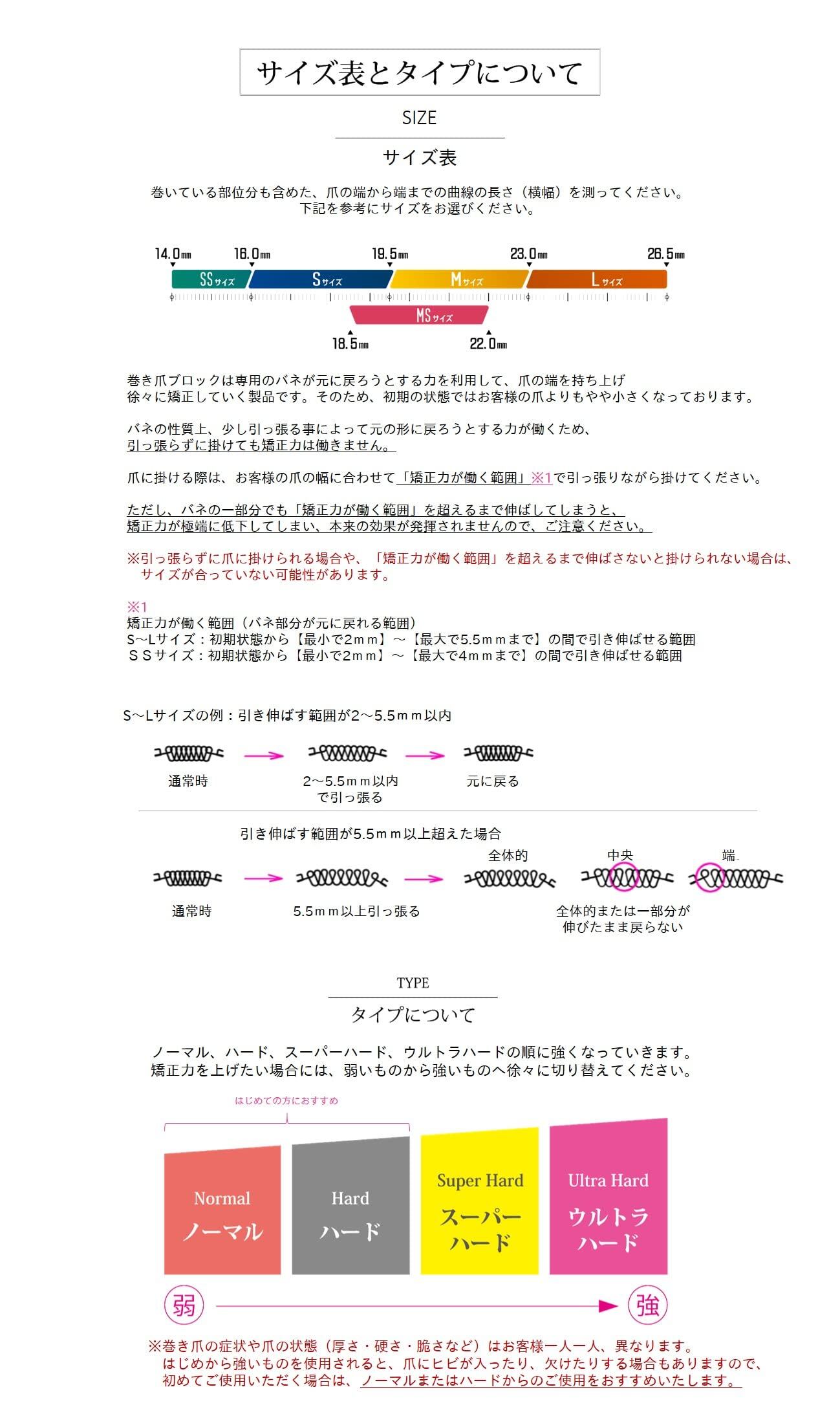 巻いている部分を含めた爪の端から端までの曲線の長さが「23.0mm〜26.5mm」の範囲の方がご使用になれます。巻き爪ブロックを初めてご購入・ご使用される方は爪の割れや欠けを考慮し、ノーマルタイプまたはハードタイプからのご使用をおすすめ致します。また、適応サイズの範囲内であれば足の親指以外の爪でも使用可能ですが、初めてご使用になる場合には爪の割れや欠けを考慮し、ノーマルタイプからお試しください。