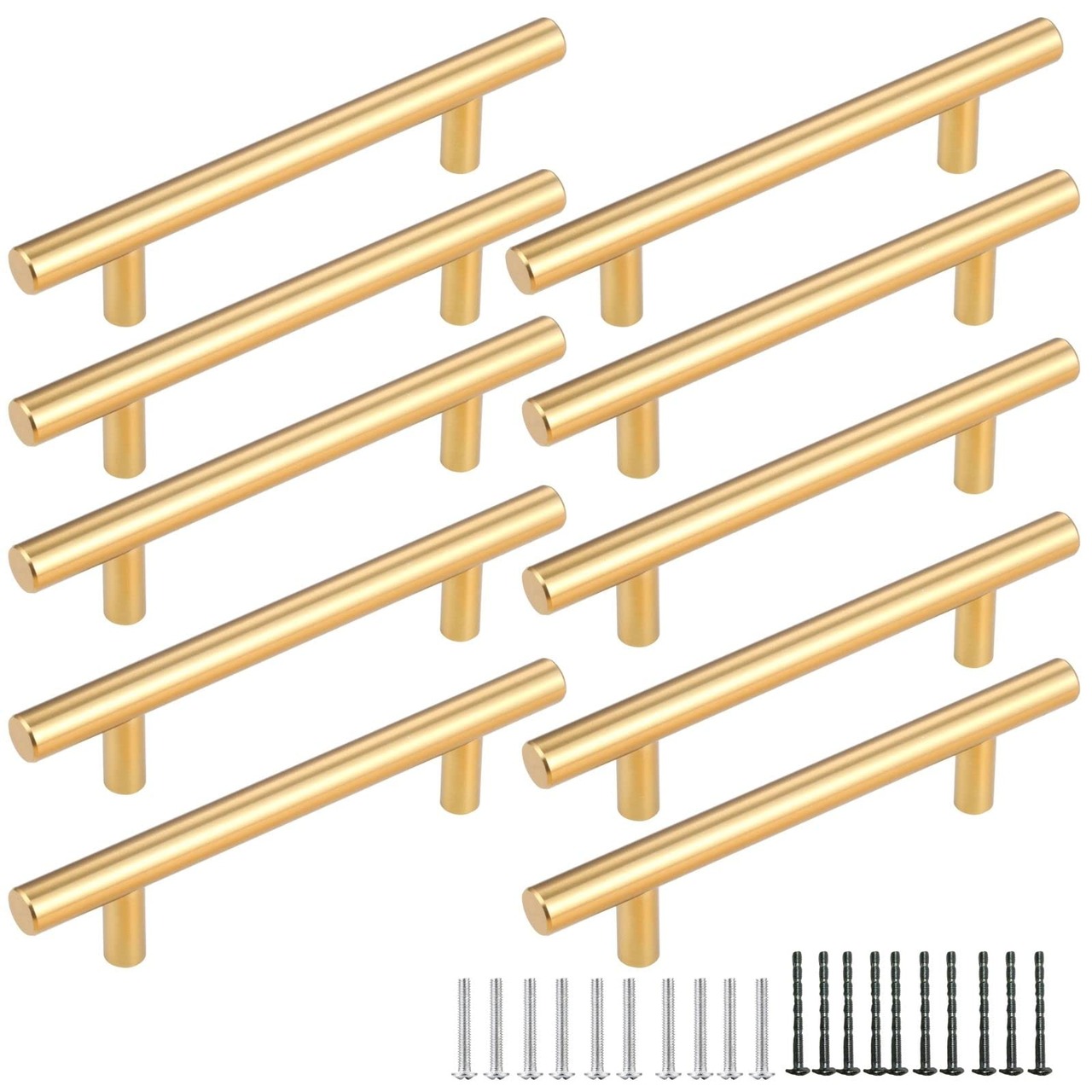 【在庫処分】取っ手 10個 キャビネットハンドル T字ドアハンドル アルミ合金製 ゴールド 引き出しハンドル 2種類ネジ付 家具 食器棚 台所 キッチン 玄関扉取手 Lemfema【穴間距離96mm 全長150mm】 | Mystiqon