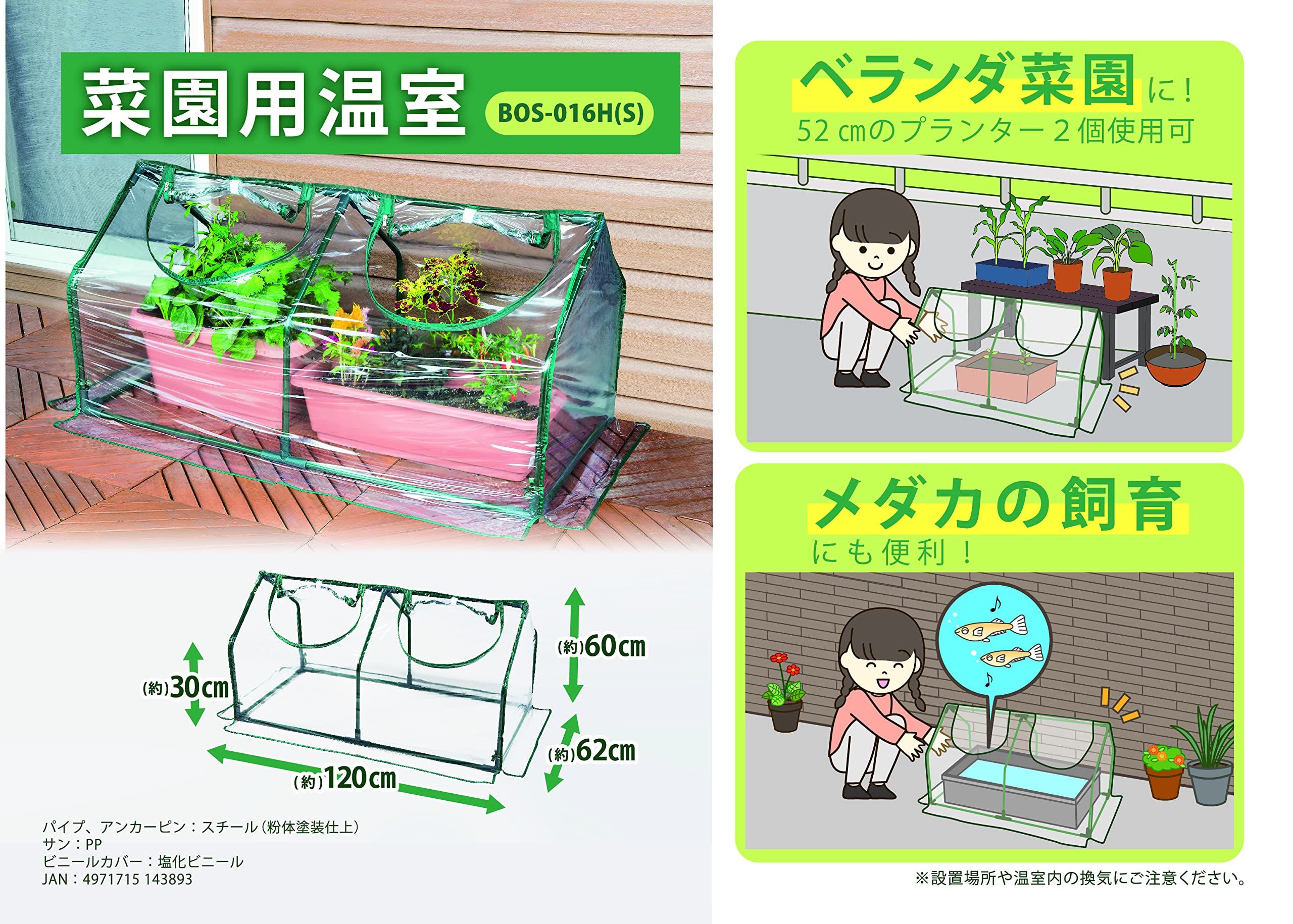 このビニール温室は、鋭利なエッジや重い部品を扱うことがあります。組み立てや設置時は、注意してください。また、長期の日光や雨に晒されるため、適切な保管とメンテナンスを心がけてください。