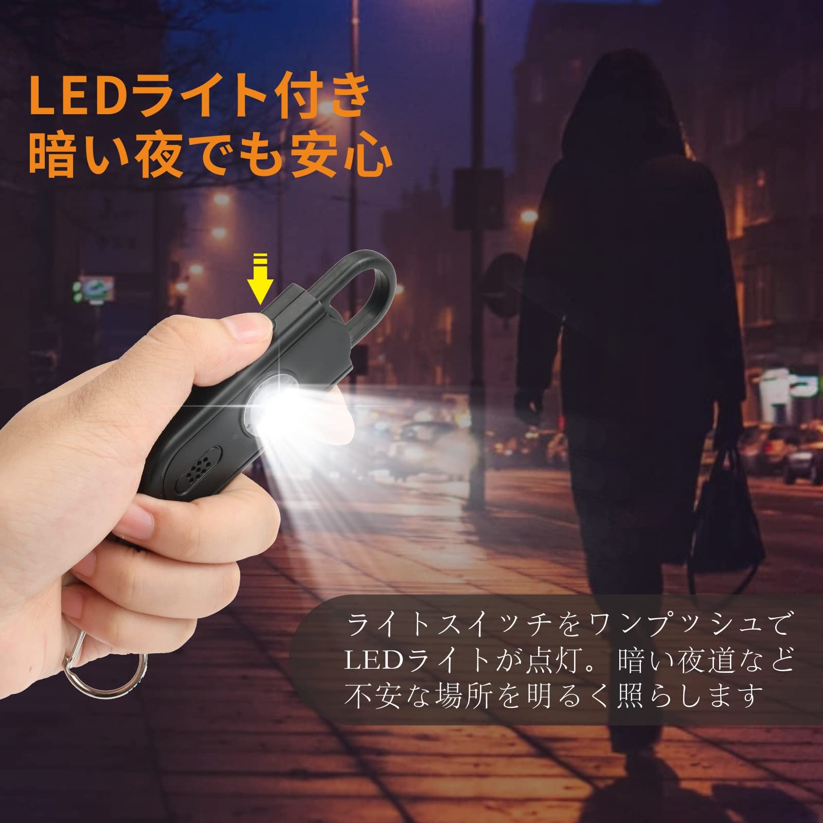 【簡単操作 お子様でもOK】アーチ型の輪(ピン)を抜くと、アラームが鳴り響きます。ピンを戻すとブザー音が止まります。横側にあるライトスイッチをワンプッシュでLEDライトが点灯し、暗い夜道など不安な場所を明るく照らします。操作はとっても簡単で、誰でも使用できます。