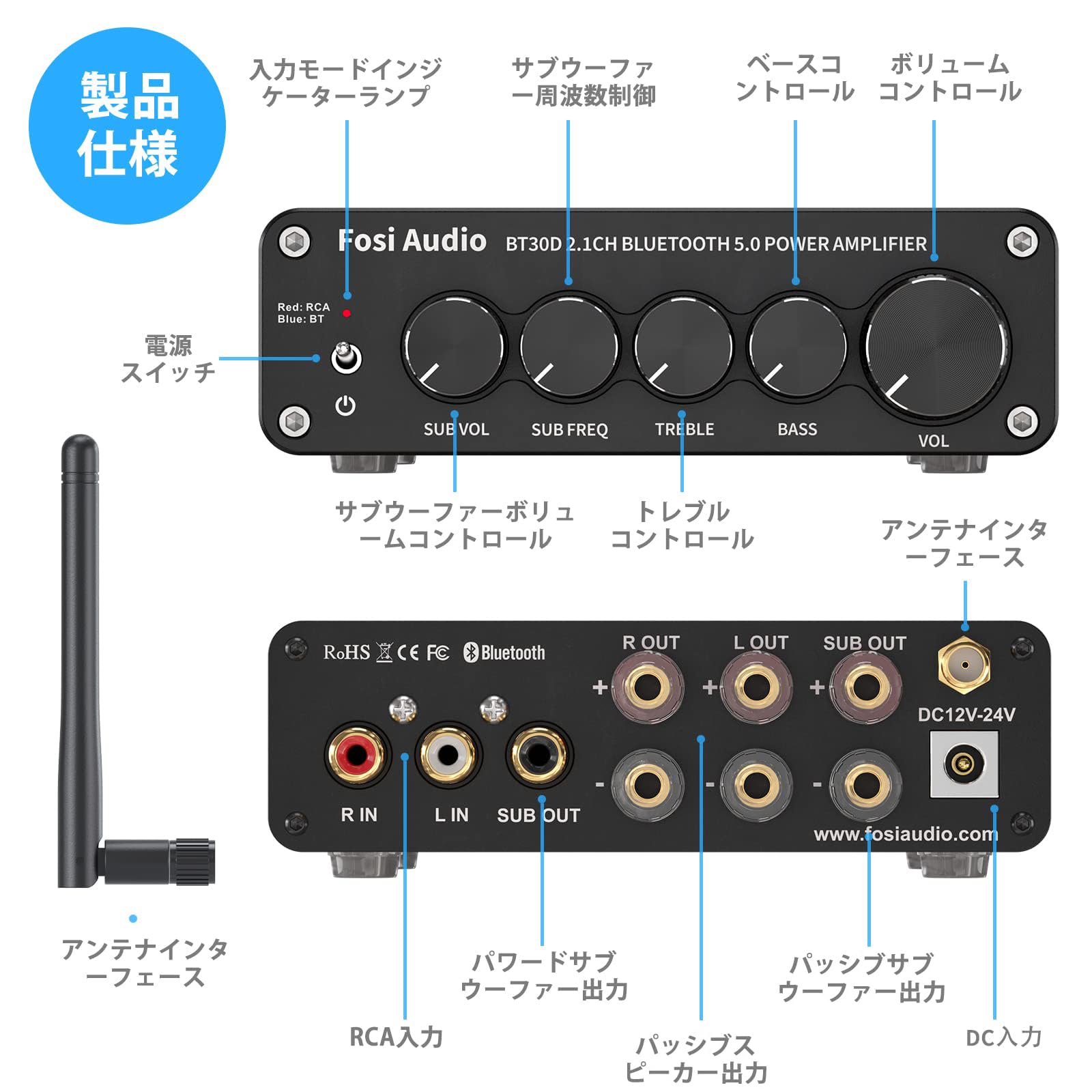 Fosi Audio BT30D Bluetooth5.0アンプ パワーアンプ サウンドアンプ SUB音量/周波数調整 高性能TPA3116D2チップ ステレオ オーディオアンプ 2.1チャンネル 小型 Hi-Fi クラスD 50W*2+100W 家庭/屋外パッシブスピーカ/サブウーファに対応 電源付き