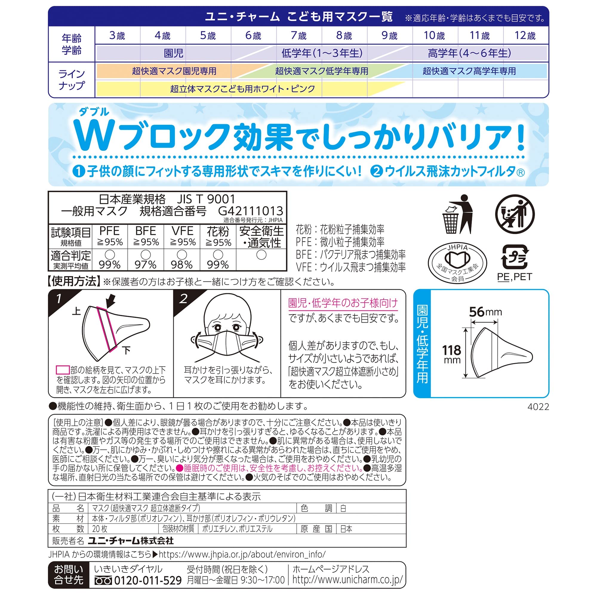 超立体マスク こども用 ホワイト 園児低学年向け 風邪・花粉用 不織布マスク 日本製 20枚入〔PM2.5対応〕(ウィルス飛沫カットフィルタ)〔JIS規格適合審査済み〕〔全国マスク工業会 会員マーク表示〕ユニチャーム 立体マスク