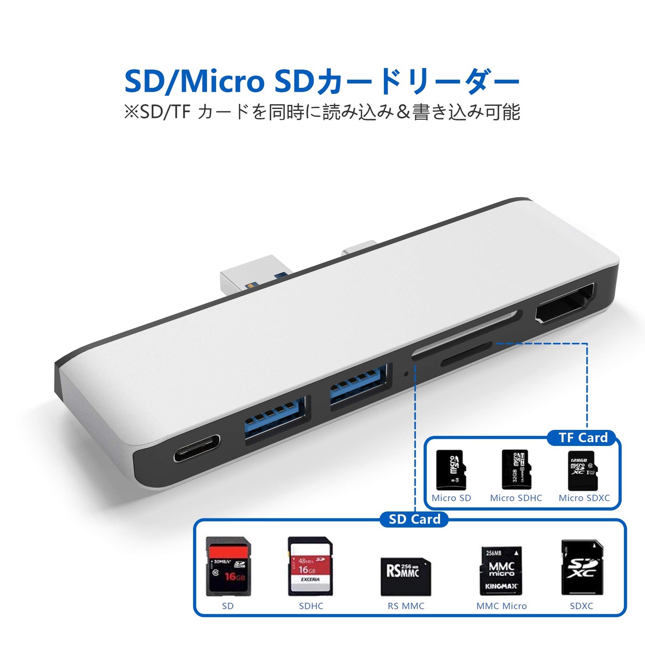 ??SD/Micro SDカードリーダー:このSurface Pro7専用ハブはSD&Micro SD カードスロットを備え、2スロットカード同時読み書き可能。SD、SDXC、SDHC、RS MMC、MMC Micro、Micro SDXC、Micro SDHC、Micro SDカードをサポートし、音楽、ビデオ、写真、ファイルをメモリカードから転送できます。