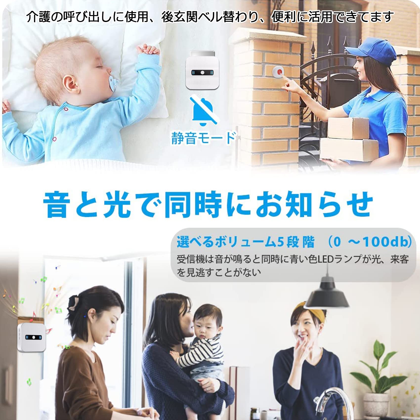 【機能】受信機の音量を調節でき、音量0-110db、20種類の音楽が選択可能、音量調節5段階です & LED指示灯。IP55防水設計で、台所、トイレやお風呂、玄関などに設置しています。