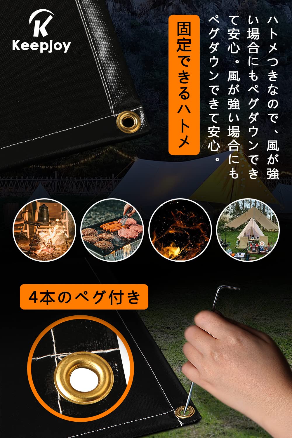 【固定できるハトメ/4本のペグ付き】17CMペグ4本付き。焚き火シートは穴があります、ペグ固定できます。強風でも安心してお使いいただけます。
