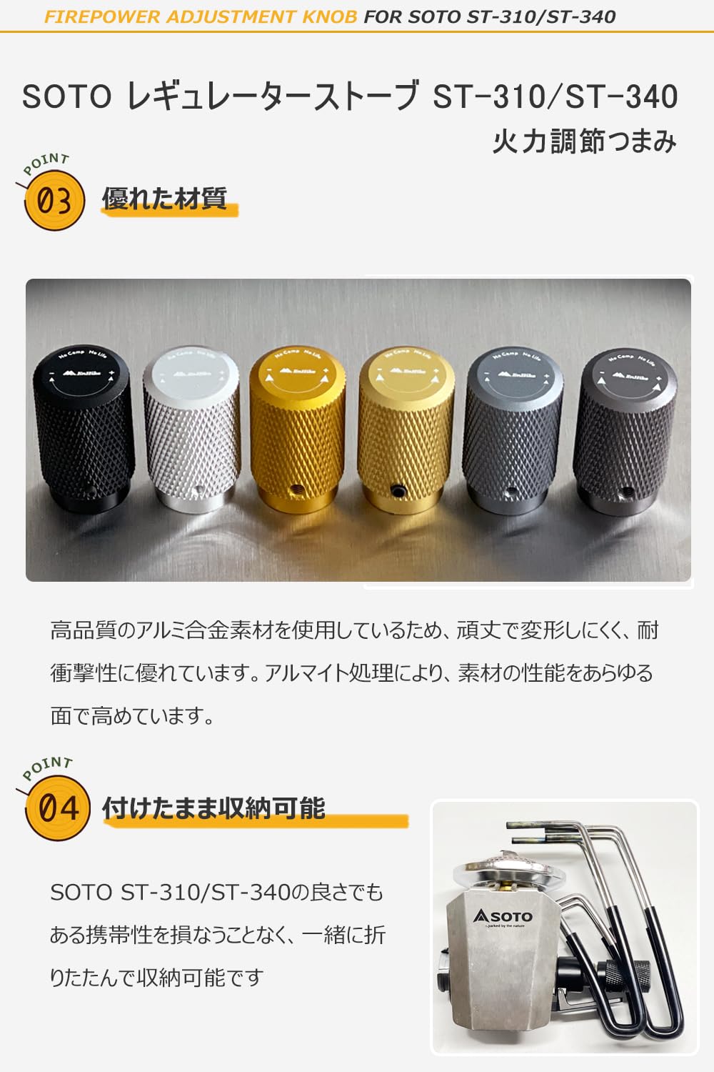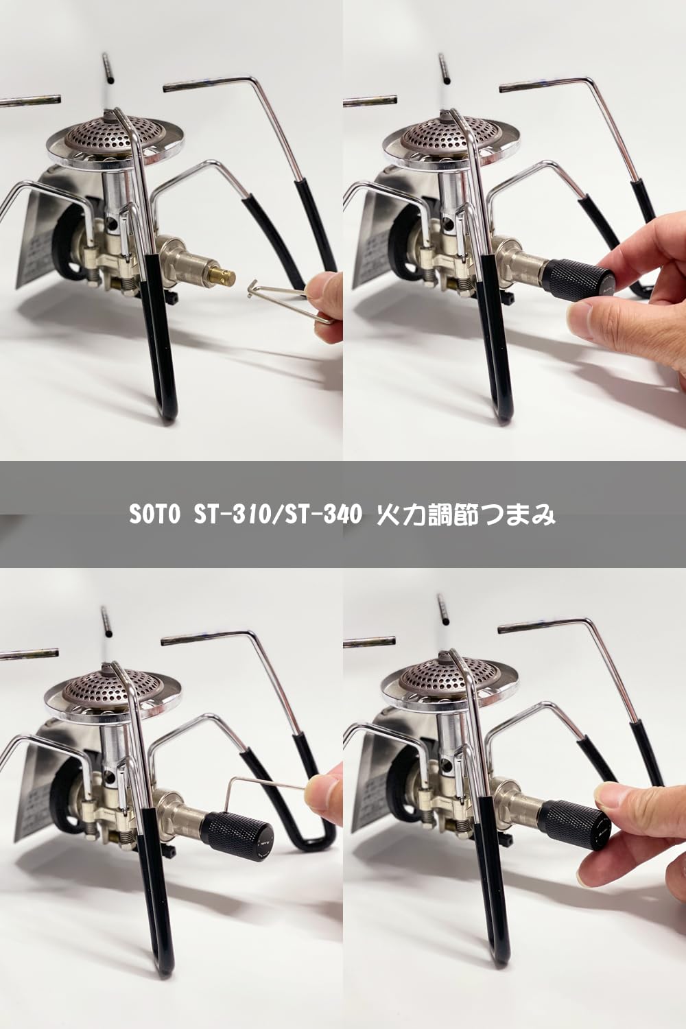 【SOTO ST310/ST340専用火力調節つまみ】本製品はSOTO レギュレーターストーブ ST-310/ST-340に取り付ける火力調整ノブです。元の器具栓つまみは使用中に硬くて、使いにくい場合が多いです。本製品を交換すると、操作感を上がることができ、シングルバーナーの火力をもっとコントロールしやすくなります