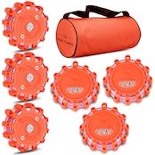 【された安全性】6つのLEDロードフレア緊急ライトのパック、収納バッグ付き、家族の間で分けるのに最適。 道端での緊急事態や遭難状況に備えて、車のトランクに常備しておくのに最適な緊急キットです。 (これらのLEDロードフレアライトには単4電池をお勧めします。電池は含まれていません)。