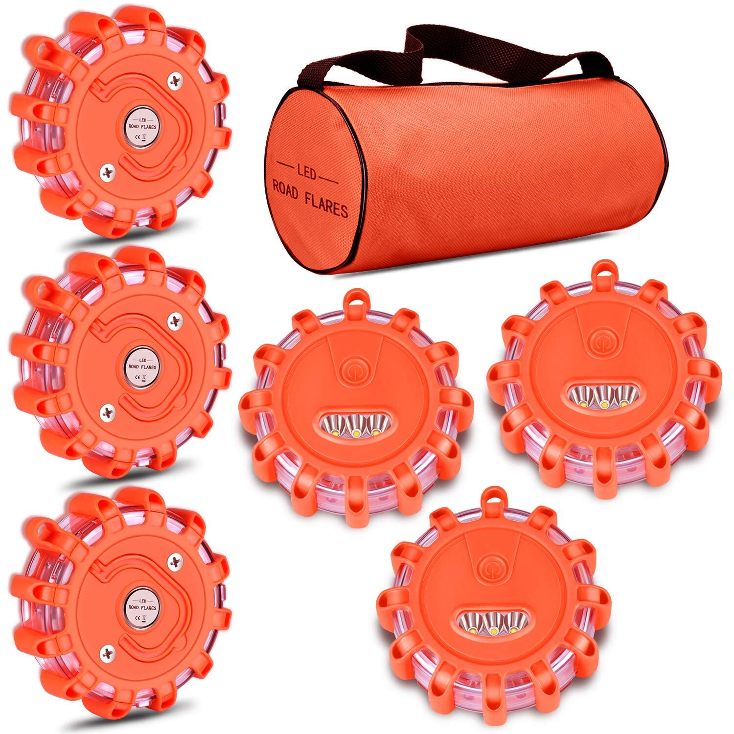[6パック] LED警告灯 非常信号灯 道路フレア ロードサイド安全ライト 緊急点滅信号灯 強烈フラッシュ 自動車に応急用ランプ SOS救助 懐中電灯 磁気ベースとフック付き 専用収納バッグ付(電池を除く) (6) (6)