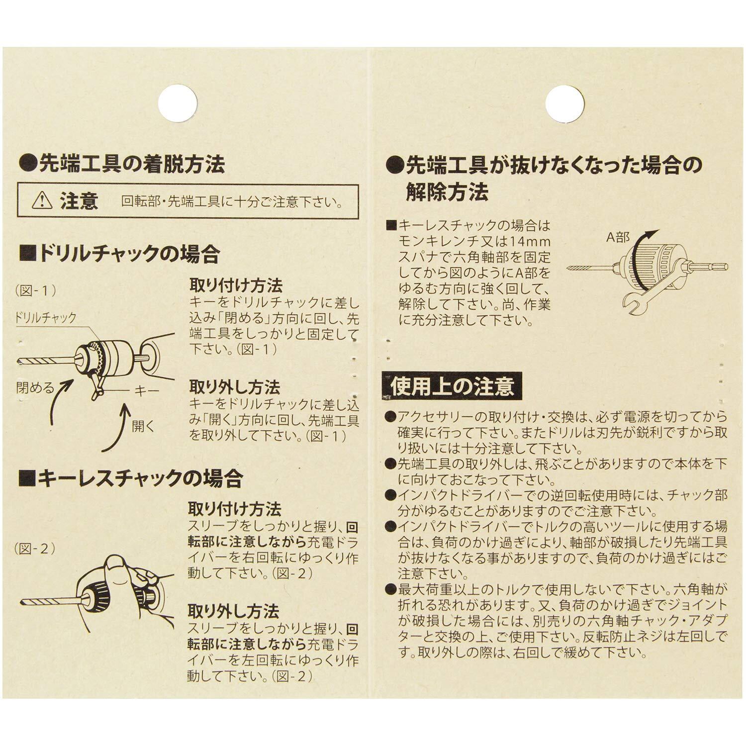 付属のチャックハンドルで三方をきっちりと締め付けてください。高トルクのインパクトドライバーで使用する場合は負荷のかけ過ぎにご注意ください。また負荷のかかりやすいホールソーなどを使用する場合もご注意ください