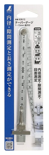 ●器差:±0.05mm<Br>●長さ(mm):160<Br>●測定範囲(mm):1〜15(テーパーゲージ)、0〜150(直尺)<Br>●測定範囲:1〜15mm<Br>●質量(g):20<Br><Br>【メーカー名】シンワ測定(株)<Br>【品番】62612<Br>【オレンジブック掲載ページ】2015-1-0929 をご参照ください。<Br>【オレンジブック発注コード】332-5865