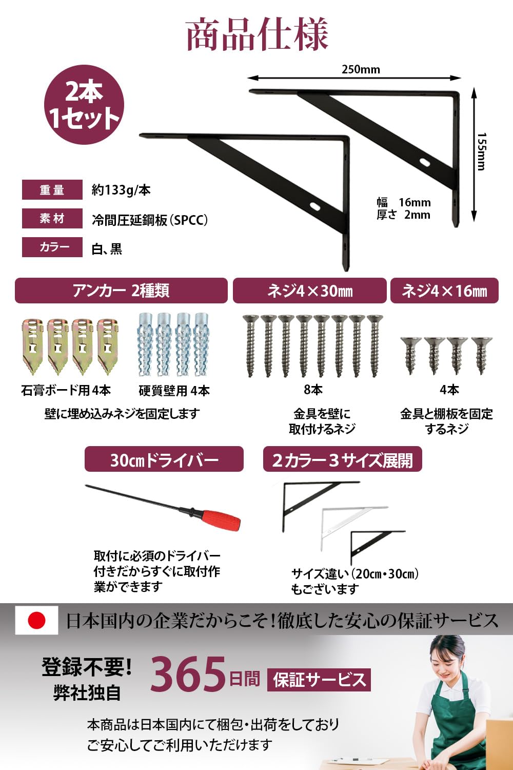 【在庫セール】BELSUS URIS 棚受け金具 固定式 25cm 耐荷重80kg【耐荷重試験実施 生産物保険加入 ドライバー付き 】アイアン おしゃれ 棚受け ブラケット L字型 棚支え 2本セット ネジ一式 白 ホワイト | Mystiqon
