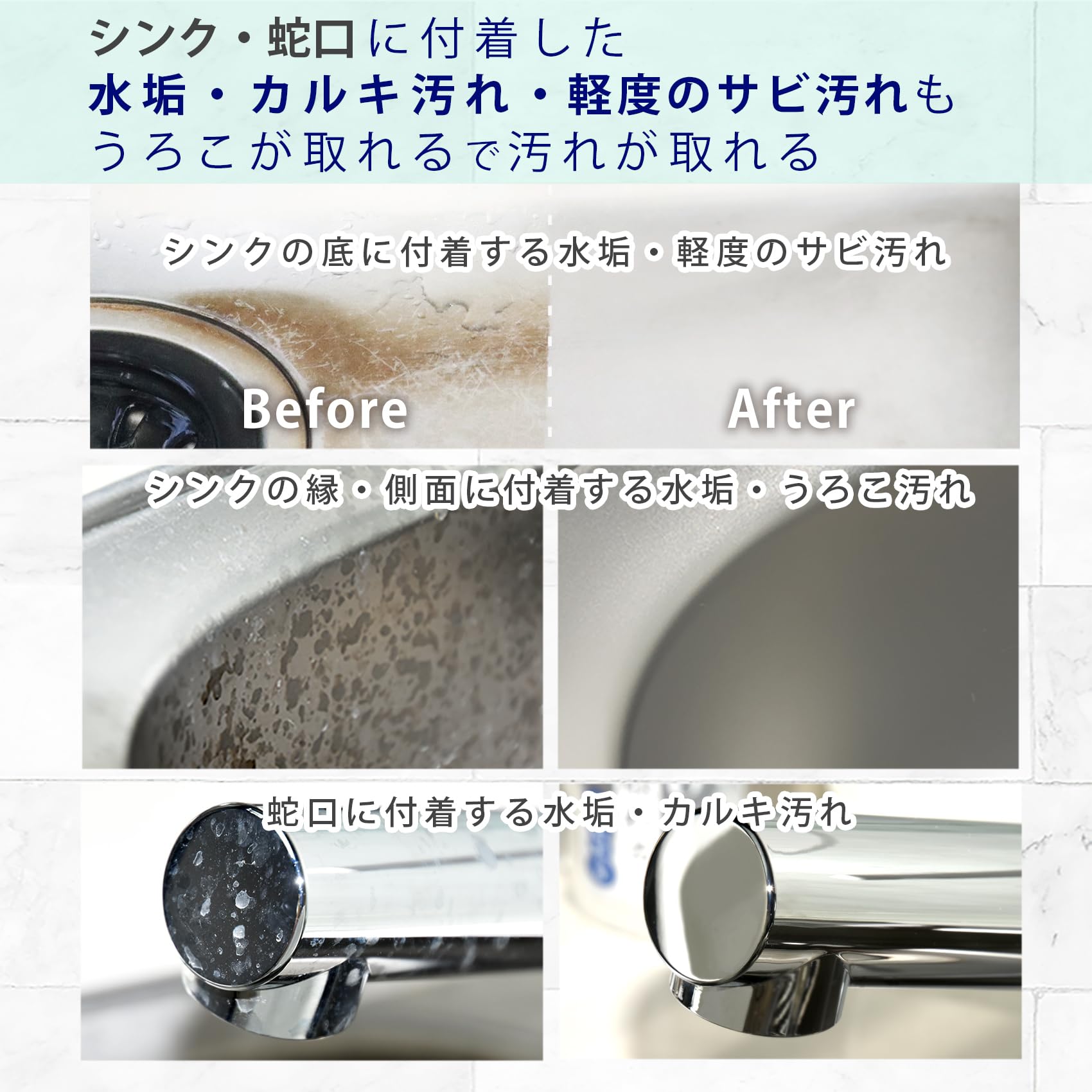 【有吉ゼミで紹介されました!】うろこが取れる その効果 感激、実感。ウロコ・水垢・油膜汚れの原因は、水道水などでの残った不純物の固まりです。素材の表面を優しく磨き上げる「琢磨成分」がうろこ汚れや水あか、カルキ汚れを落とします。