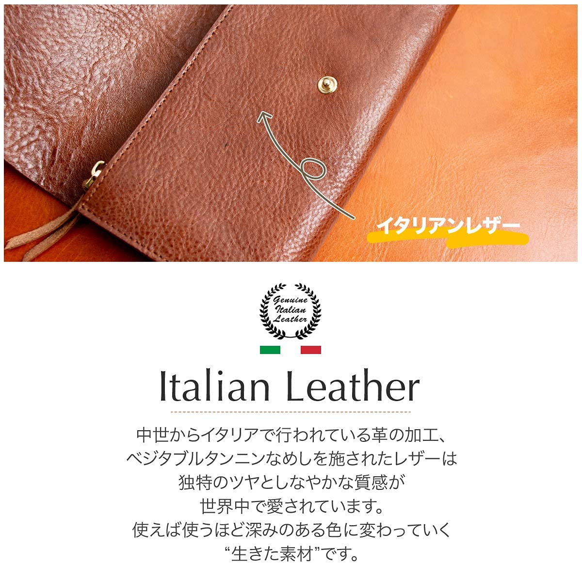 【 本物を知る大人だけが選ぶ 】イタリアで古くから続くベジタブルタンニン鞣しの製法を採用したイタリアンレザーは独特の質感、香り、色味が特徴です。生前にできたシワ、キズ、シミなどが世界で一つのオリジナルに。時間が経つにつれ変化し、オーナーとともに成長していく素材です。