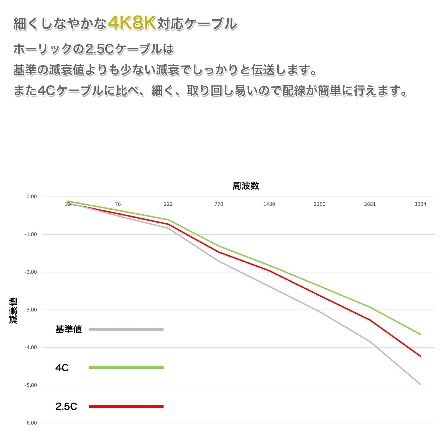 2.5Cケーブルは、4Cケーブルに比べ細く、取り回し易いので配線が簡単に行えます。