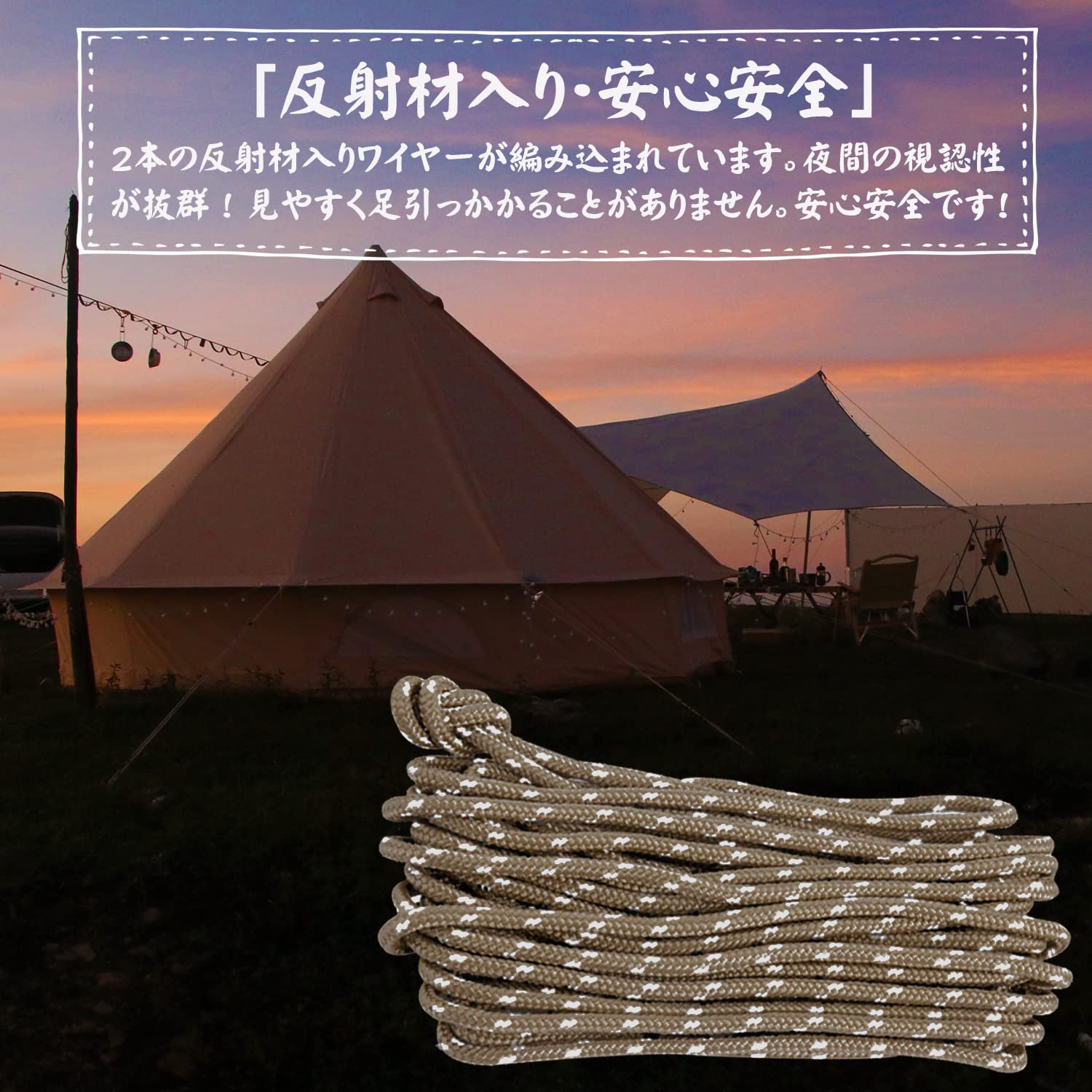 反射材入り&安全確保:反射材を2本編み込まれ、ライトを当てるとシルバーのロープかと思うぐらい光を反射します。夜間のキャンプ場ではテン トやタープの張り綱に足を引っ掛け転倒したり、更に見やすく安全性が格段に向上します