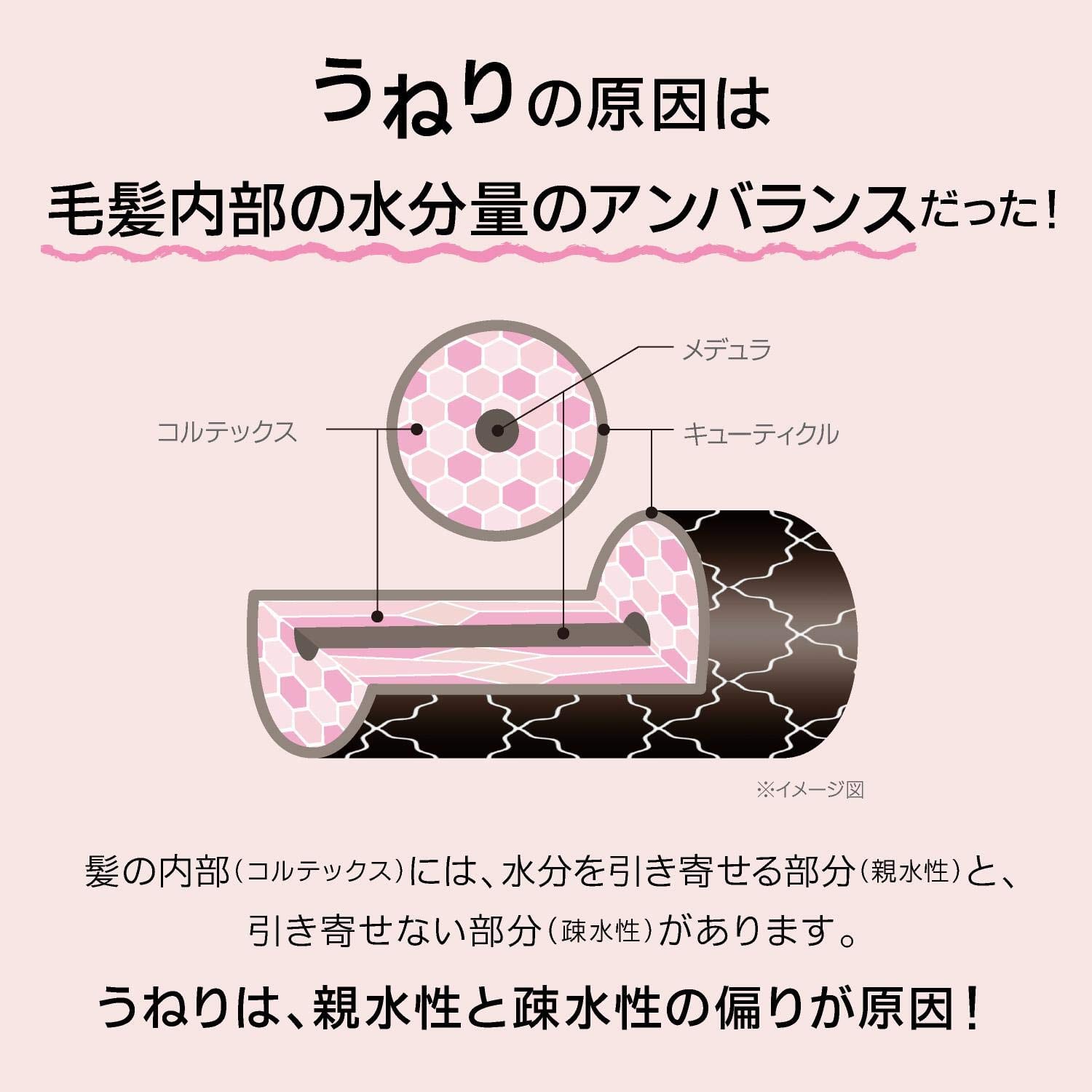 【うねりの原因は水分量のアンバランスかも?】 うねりが出るのは、髪内部の水分量のアンバランスが原因かもしれません。まっすぐは髪内部の水分量に着目。髪をまっすぐサラサラに保つためには、水分量のコントロールが大事なのです。