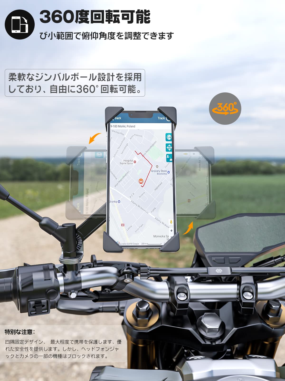 ★「使用が簡単で便利」四本爪を持つフォックは自由に伸縮調整可能で、様々な携帯サイズを対応できます。携帯ホルダーは平面360度旋回可能、及び小範囲で俯仰角度を調整できます。それによって携帯が最良の角度になり、ライディングに差し支えないようにします。