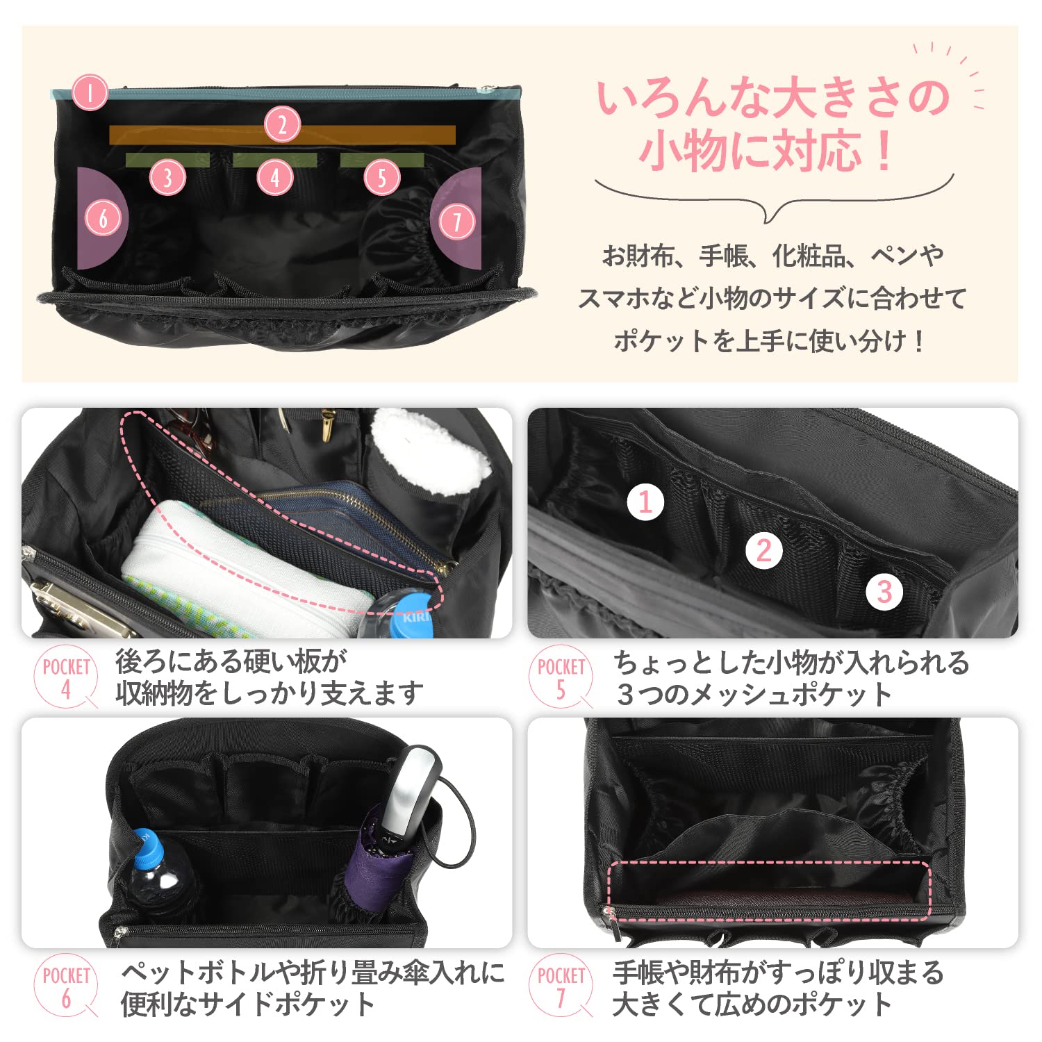 ?15個の小分けポケット 大小様々なポケットがありますので鍵、スマホ、財布等、ピッタリサイズのポケットを見つけられます。