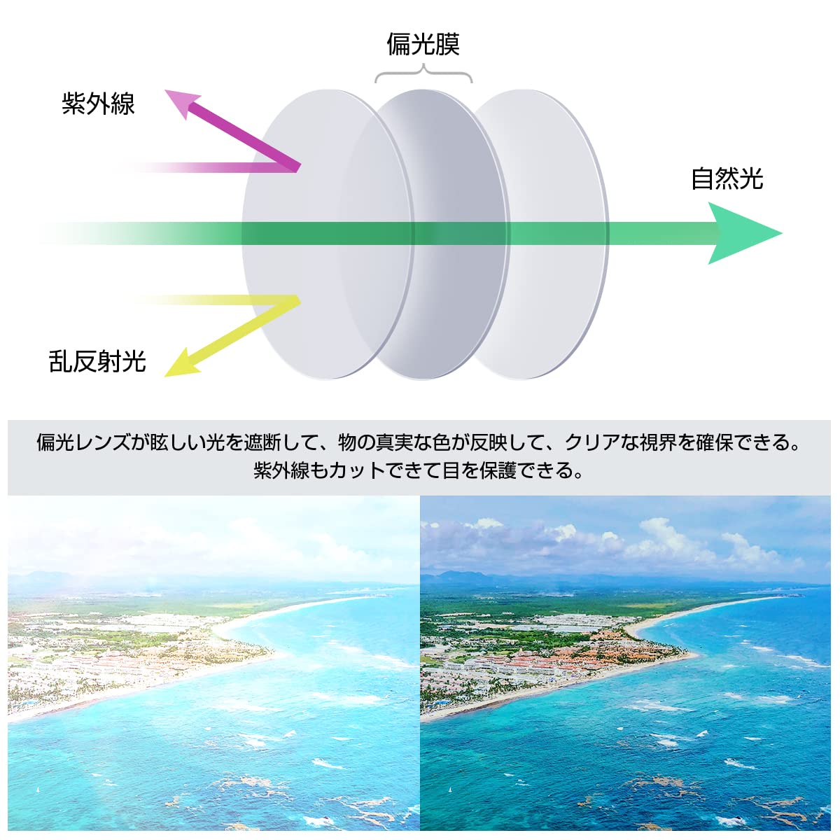 紫外線カットできる偏光レンズを採用して、路面の照り返しや水面のギラツキを抑え見やすさも抜群です。