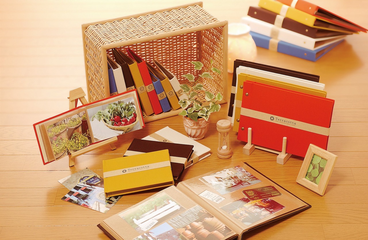 *Terracotta (テラコッタ)とは「焼いた土」という意味を持ち、「ぬくもり・親しみやすさ」をテーマに、素材感のある布地表紙とクラフト台紙を使用した雑貨スタイルアルバム。パーソナル・オフィス・店舗など幅広く使えるよう、シンプルなデザインに欧風カラーで仕上げた。