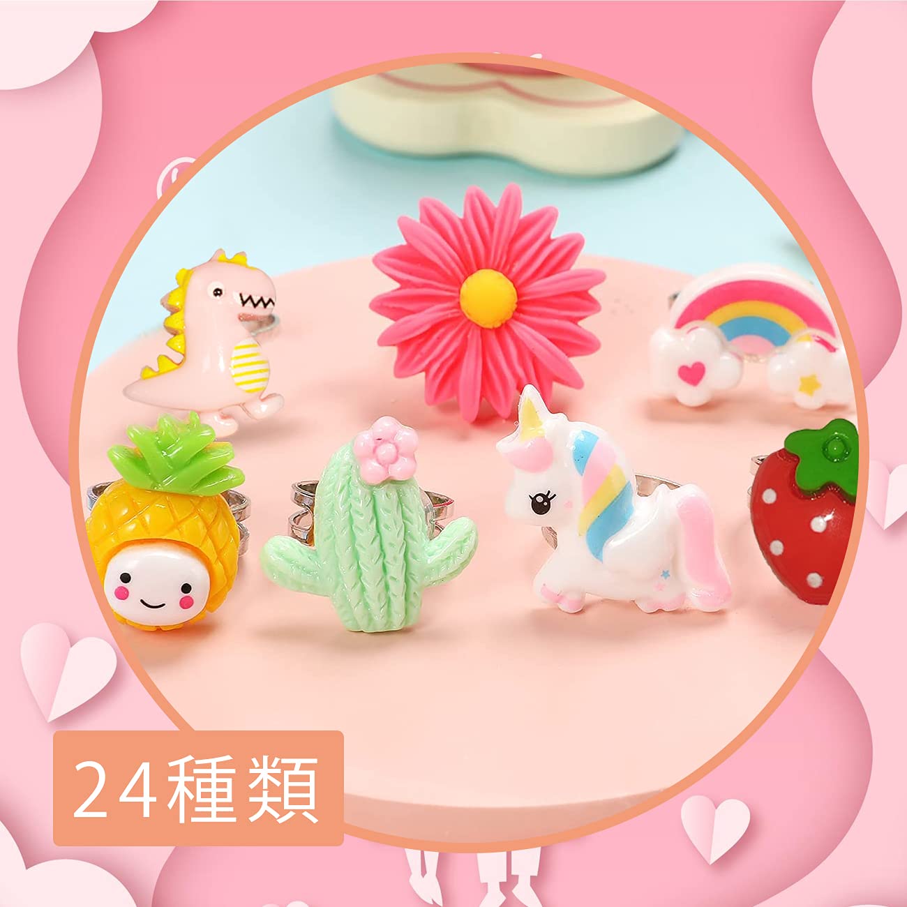 【彩なデザインセット 】ユニークな24個のリングセット。ユニコーン、フローラル、フルーツ、アイコンタッチ、ポップアート、アニマルモチーフなど、様々なスタイルに対応するトレンディなデザインが揃っています。