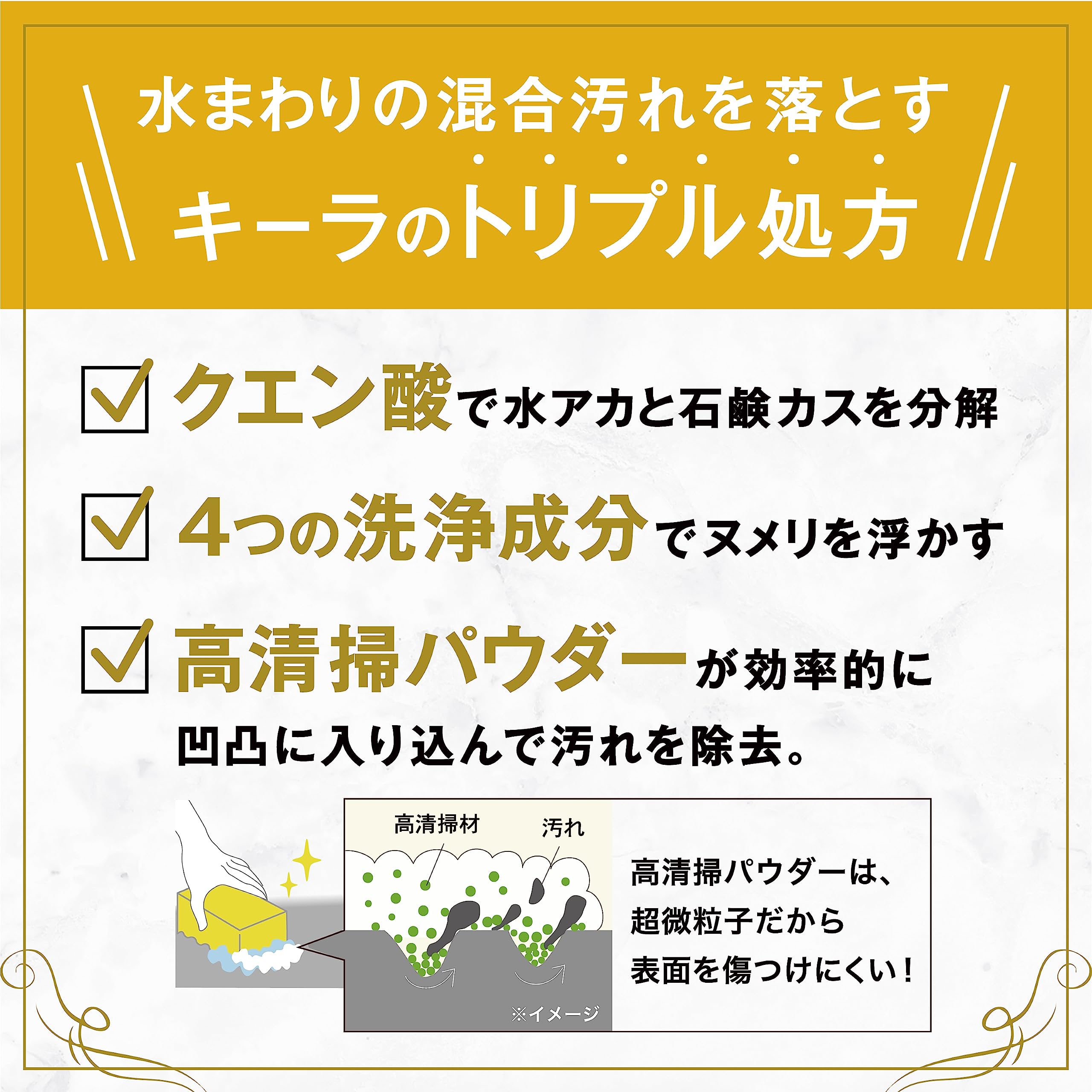 【ワンランク上の輝きを実現するプレミアム洗剤】クエン酸+4つの洗浄 成分+高清掃材(研磨材)で水まわりの混合汚れである水アカ、石鹸カス ヌメリを落とします。ステンレス本来の光沢のよみがえりにも効果を発 揮します。
