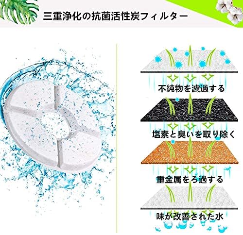 ??機能:水道水をつねに軟水化し、皮毛、食べ残し、埃を取り除きながら循環しています。水を新鮮な状態に保持する仕組みがあります。水の爽やかさを維持するためにフゥルターが2−4週間を目処に、または被毛や食べかすなど、目に見える汚れが目立つ時に交換してください。