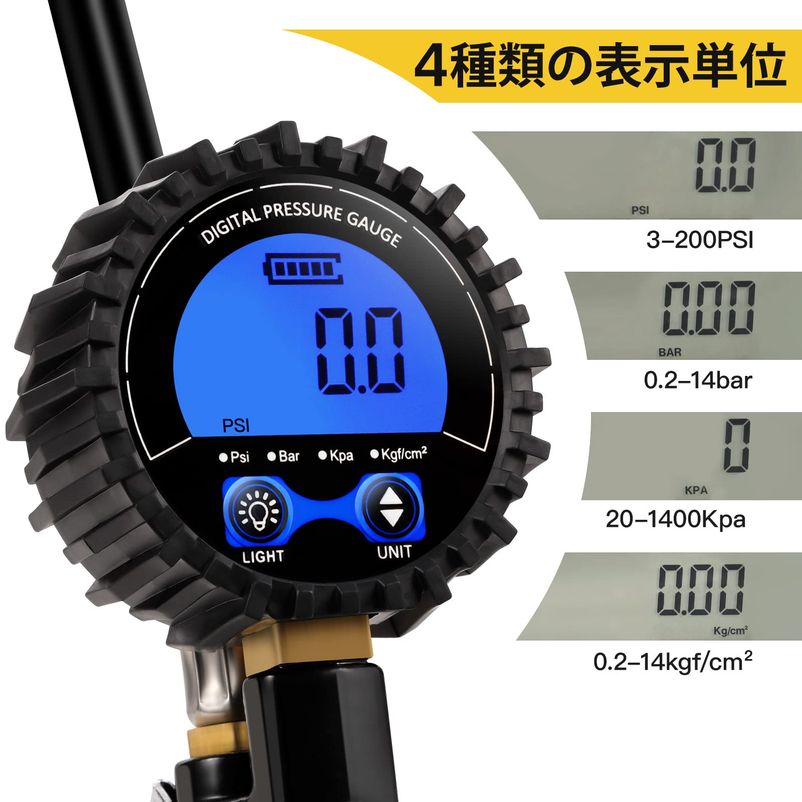 【在庫処分】【アップグレード版】OOWOLF エアゲージ エアチャックガン タイヤゲージ デジタル式 200PSI/1400kPA空気圧ゲージ 高精度 空気圧測定 空気入れ 空気抜き 自動車&自転車兼用 LCDデジタル表示 10PCS | Mystiqon