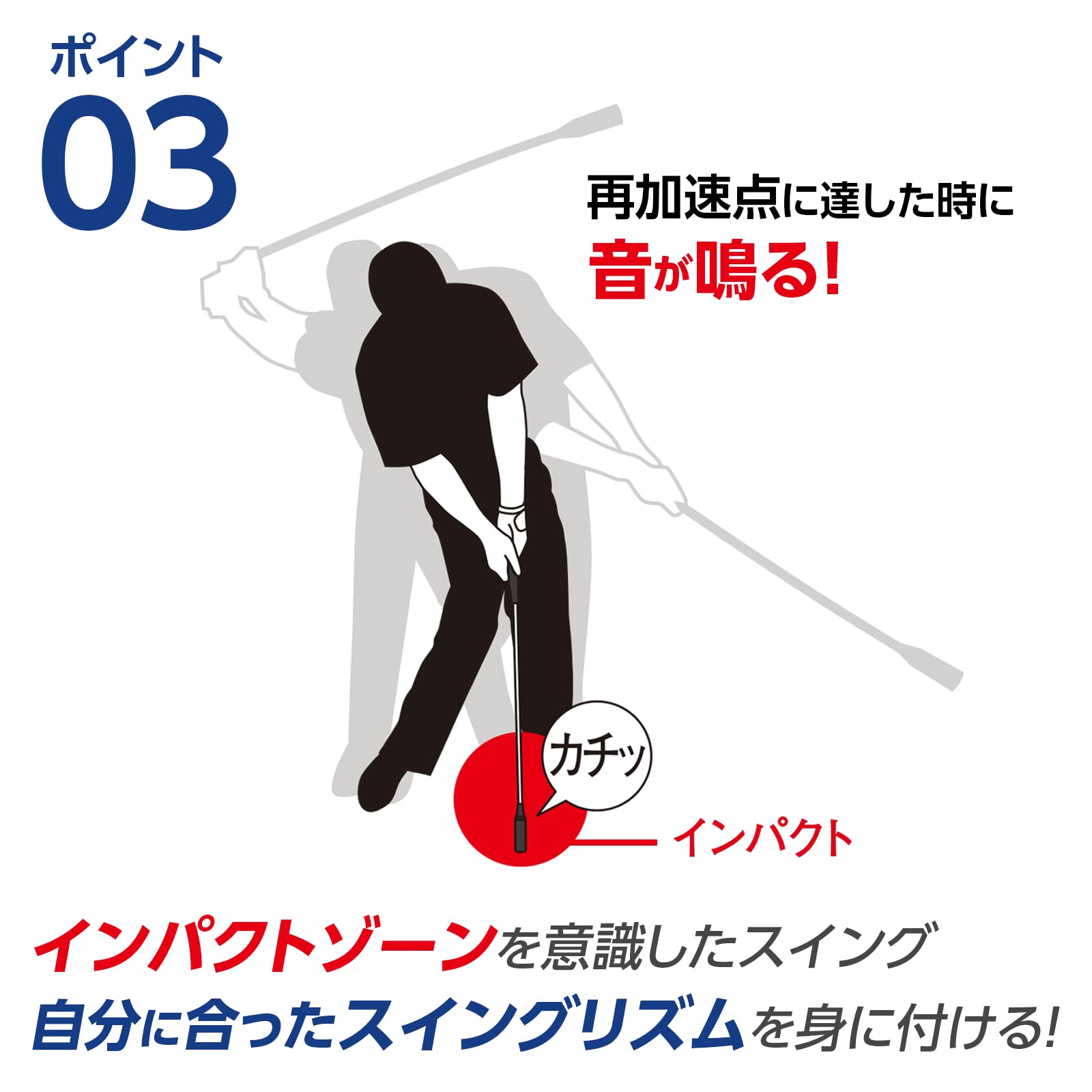最加速点で音「カチッ」が鳴るので、インパクトゾーン付近で鳴るようにスイングリズムを整えることで、飛距離UPの練習になります。