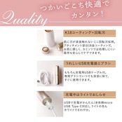 ・充交両用:可 ・充電式:○ ・入力端子:USB Type C ・定格入力:DC5.0V 1.0A ・充電時間:約10時間 ・放電時間:約60分 ・使用電池:ニッケル水素電池 ・回転数:約6500rpm ・アタッチメント:フェイス用アタッチメント ・刃:ステンレス ・水洗い構造:アタッチメントのみ可 ・付属品:USBケーブル、キャップ、掃除用ブラシ ・サイズ:約27(W)×29(D)×113(H)mm ・質量:約55g(キャップ装着時)