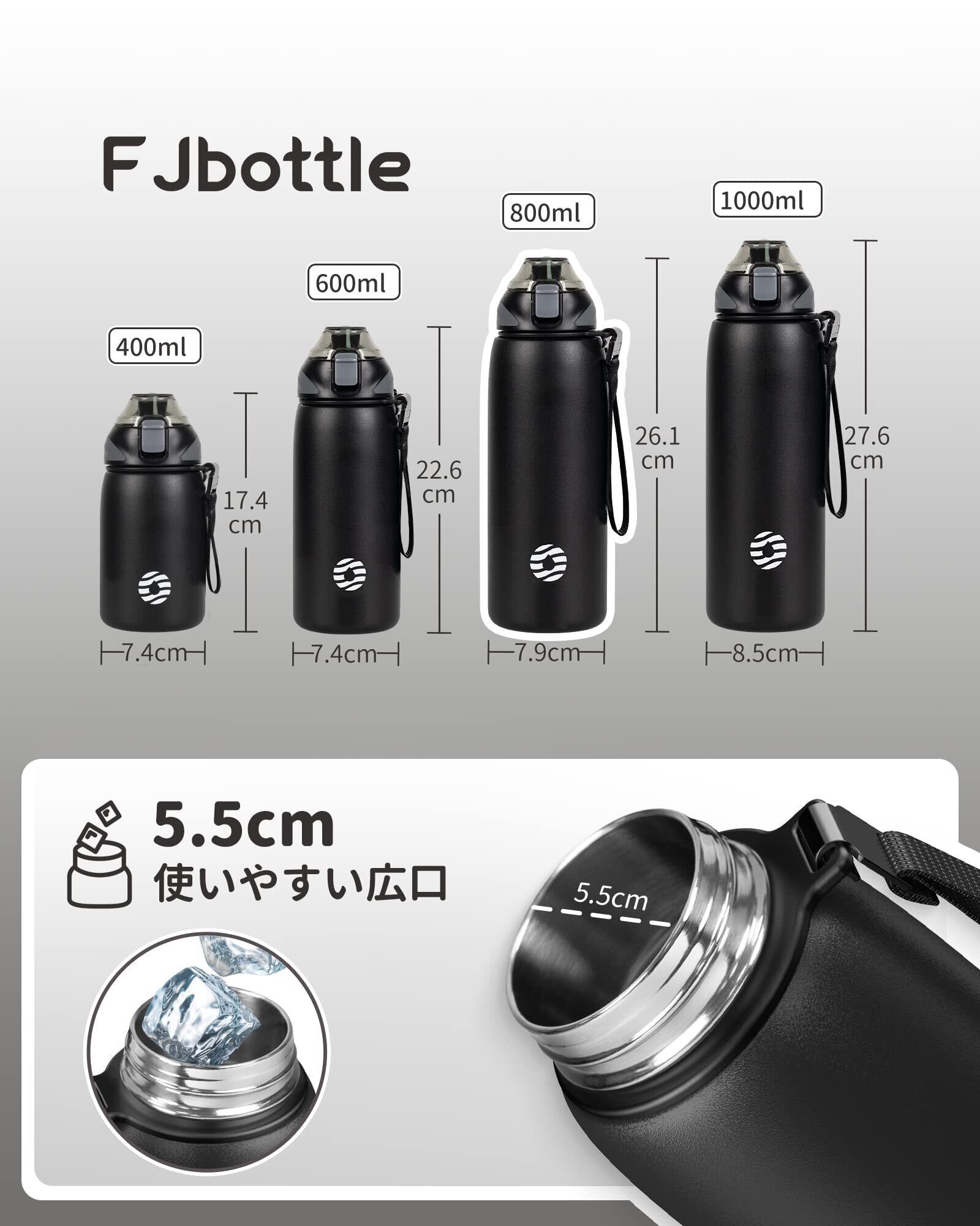 FJbottle 水筒 0.8L 真空断熱 ワンタッチ スポーツボトル 0.8リットル 保温 保冷 スポーツ飲料対応 広口 洗いやすい ステンレスボトル 水筒カバー 洗浄用スポンジ付き 女の子 男の子 おしゃれ 大人 子供 ブラック