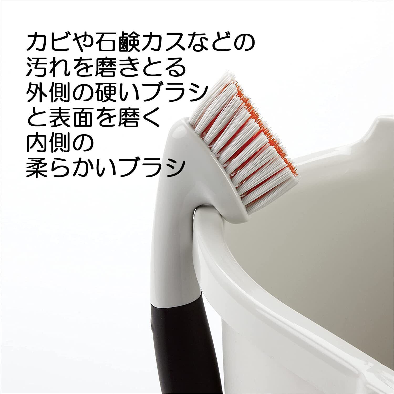 カビや石鹸カスなどの汚れを磨きとる外側の硬いブラシと表面を磨く内側の柔らかいブラシ