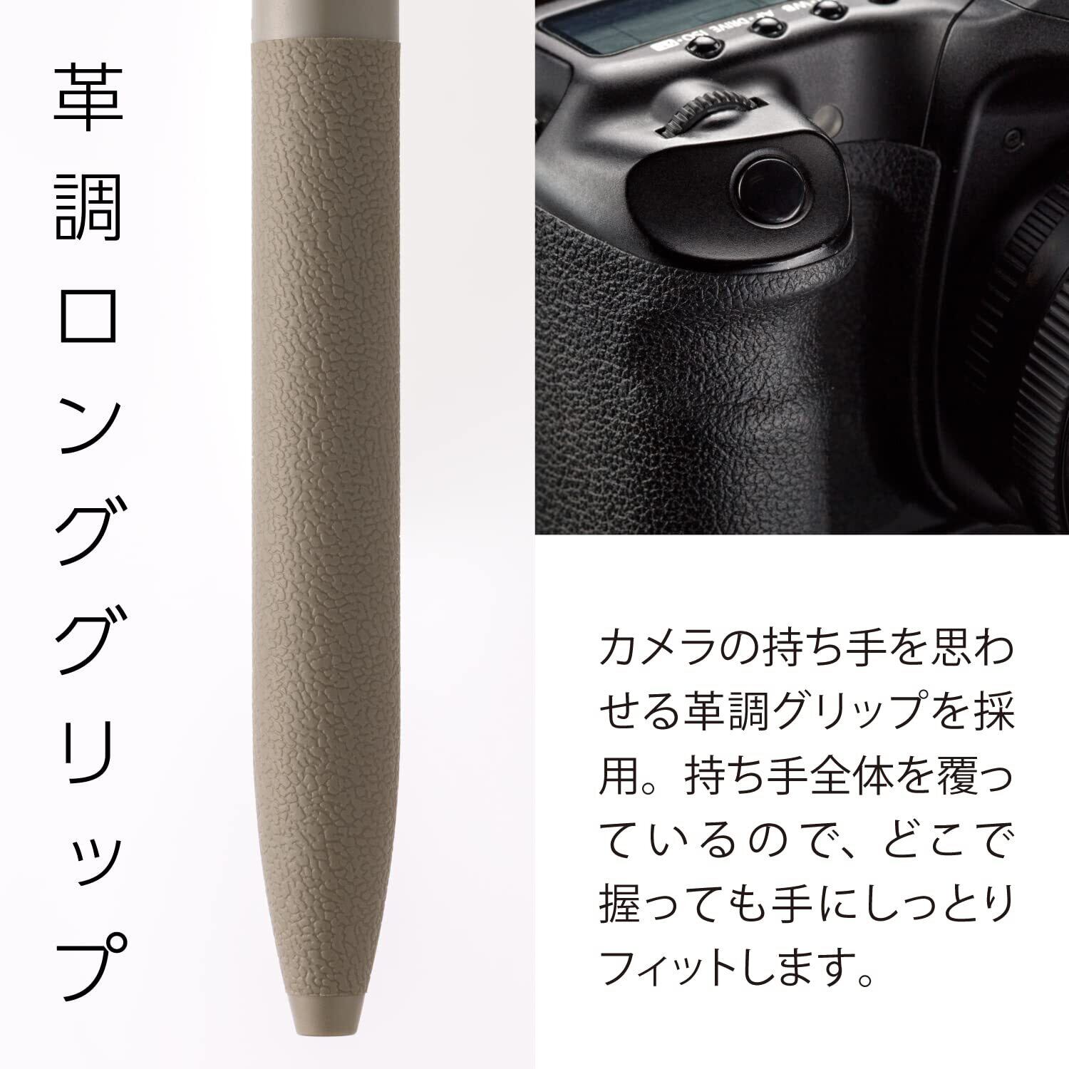 心地よく静かなノック感で使う人や環境に調和する、新しいなめらか油性ボールペン。カメラの持ち手にも使われる革調のロンググリップを採用しており、筆記時の安定感も抜群です。シンプルながら個性のあるシルエットは流行に左右されず、男女関係なく使う人になじみます。