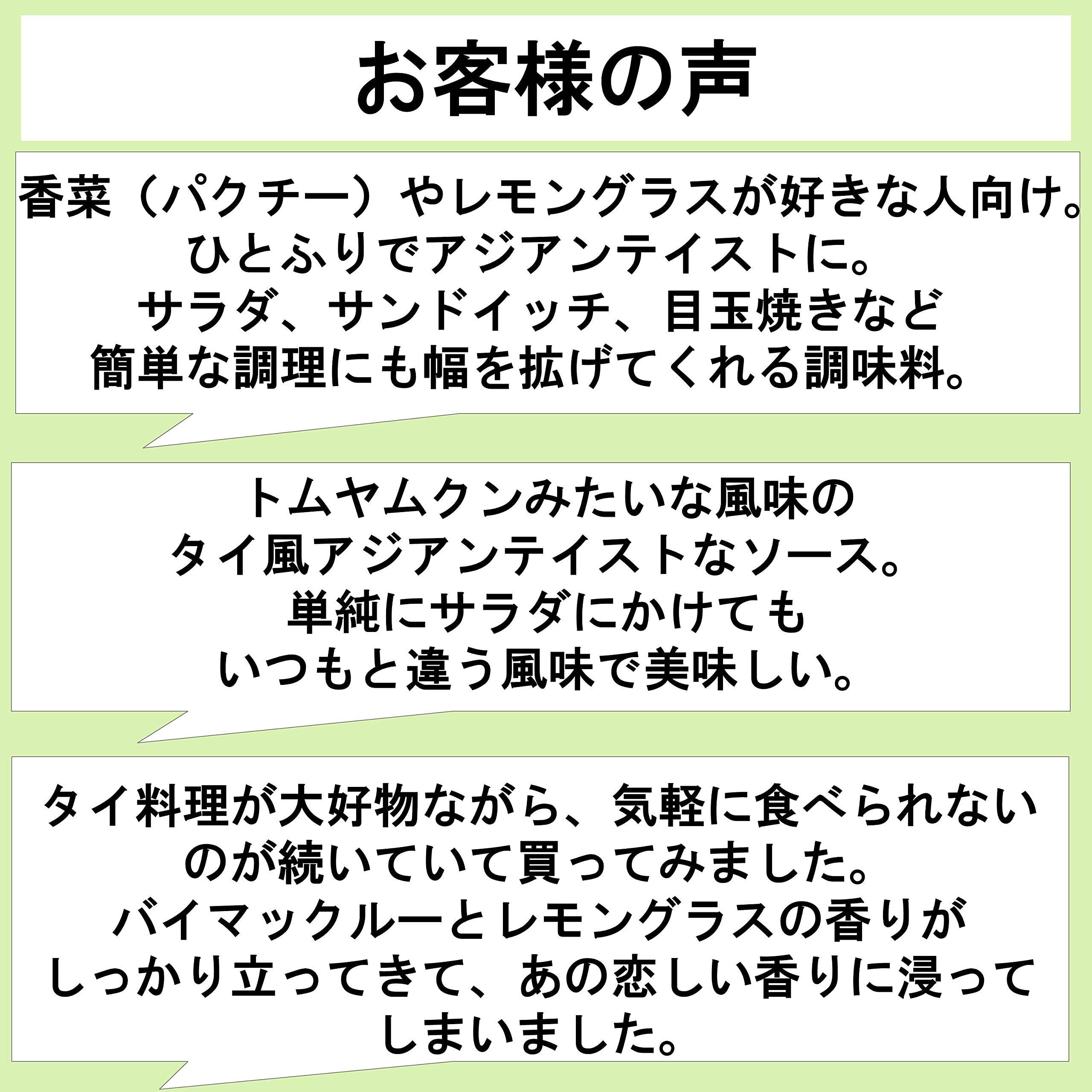 東南アジアでよく使われる2種類のアジアンハーブ「バイマックルー」と「レモングラス」を使用した香りと酸味が特長のソースです。