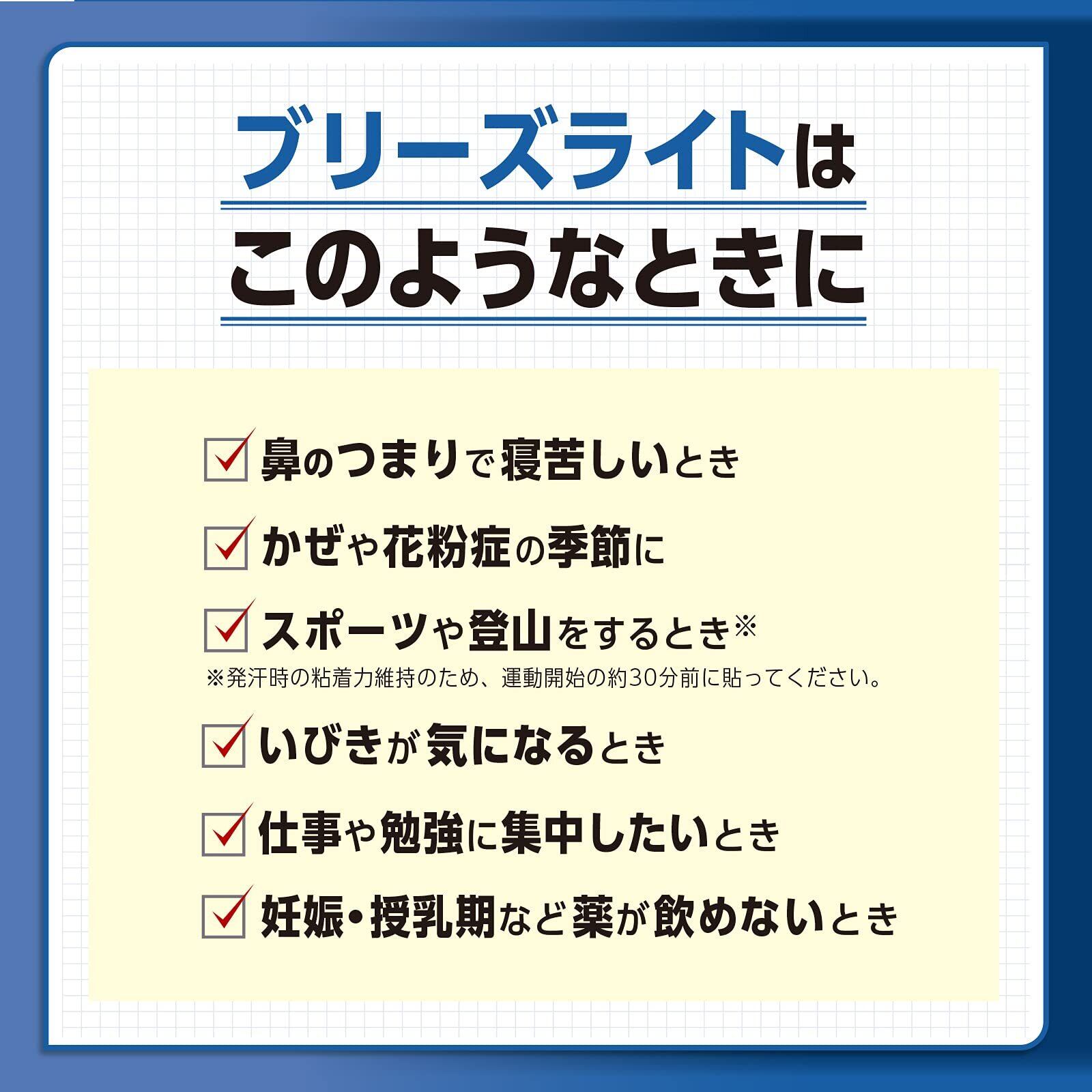 【商品説明】 「ブリーズライト スタンダード 肌色 レギュラー」は、プラスチックバーの反発力で鼻腔を拡げて、鼻のとおりをスムーズにします。鼻がつまって寝苦しく、良く眠れないとき、鼻の上に貼るだけで鼻の呼吸をサポートします。 鼻からスッキリ、翌朝スッキリ*。 *ブリーズライト鼻孔拡張テープは、あなたの呼吸をラクにし、快適な睡眠をサポートします。 【製品特長】 ・プラスチックバーが、鼻をやさしく持ちあげ鼻腔を拡げます。 ・ブリーズライト独自の粘着層が、ぴったりフィットします。 ・通気率を最大31%アップ* ・いびきを軽減します。 *自社調べ、貼らない時との比較 【使用上の注意】 ・使用に際しては、添付の説明書をよく読んでください。 ・本品は、鼻腔を広げるため鼻の表面に装着するテープです。本来の目的以外に は使用しなでください。 ・5歳未満のお子様には使用しないでください。 ・キズ、湿疹、日焼け、かさつきなど皮膚に以上がある場合は使用しないでください。 ・本品の使用によって睡眠時無呼吸症候群が緩和されることはありません。 ・昼夜を問わずに使用できますが、1日12時間以上続けて使用しないでください。発疹、かぶれの原因になることがあります。 ・本品をはがす時は、ぬるま湯などで充分ぬらしてからゆっくりとはがしてください。 ・本品は粘着剤に天然ゴムを使用していません。本品を包んでいるシート(包み紙)には天然ゴムを接着剤として使用していますので、天然ゴムアレルギーの方は シート(包み紙)の接着剤に触れないようにご注意ください。 【使用方法】 1:鼻をよく洗って乾燥させます。 2:中央を鼻の中心に合わせ、ブリーズライトの両側をみつけた位置に合わせます。 3:両側を鼻にそって曲げて、指でさすってしっかりと接着させます。 【お問い合わせ先】 輸入販売元:佐藤製薬株式会社(製品の問合せ先:03-5412-7393) 安全警告 ●ご注意:●使用に際しては、添付の説明書をよく読んでください。 ●本品は、鼻腔を拡げるため鼻の表面に装着するテープです。本来の目的以外には使用しないでください。 ●5歳未満のお子様には使用しないでください。 ●キズ、湿疹、日焼け、かさつきなど皮膚に異常がある場合は使用しないでください。 ●本品の使用によって睡眠時無呼吸症候群が緩和されることはありません。 ●昼夜を問わずに使用できますが、1日に12時間以上続けて使用しないでください。発疹、かぶれの原因になることがあります。 ●本品をはがす時は、ぬるま湯などで充分ぬらしてからゆっくりとはがしてください。 ●本品は粘着剤に天然ゴムを使用していません。本品を包んでいるシート(包み紙)には天然ゴムを接着剤として使用していますので、天然ゴムアレルギーの方は、シート(包み紙)の接着剤に触れないようご注意ください。 ご注意(免責)>必ずお読みください こちらの商品はポスト投函(追跡あり)での発送になります。盗難、箱つぶれ等のがございません。あらかじめご了承ください。