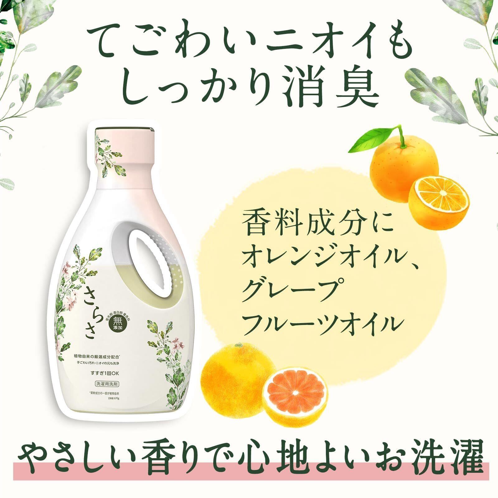 厳選された植物由来成分配合*で、大切な肌を優しく包み込みます。 皮膚科医監修の元、肌テスト済み**なので、安心してお使いいただけます。 天然酵素を配合。頑固な汚れもしっかり落とします。 洗剤残りの心配もありません。 蛍光剤・漂白剤・着色料無添加。 すすぎ1回OK 優しい柑橘系の香り *柔軟成分の一部が植物由来 **すべての人の皮膚に影響がないわけではありません。