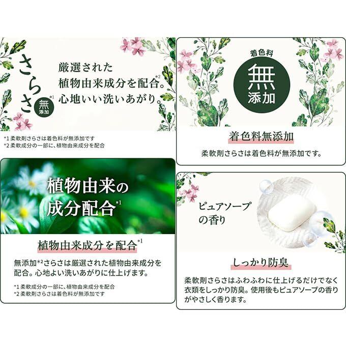 【衣料用洗剤】新しくなったさらさは、無添加*1さらさ史上、最高洗浄力を実現。 クエン酸配合*2だから、手ごわい汚れ・ニオイの元も洗浄します 植物由来の厳選成分を配合*3で大切な肌を優しく包み込みます。 洗剤残りの心配もありません。 蛍光剤・漂白剤・着色料無添加。 すすぎ1回OK ほのかでやさしい柑橘系の香り