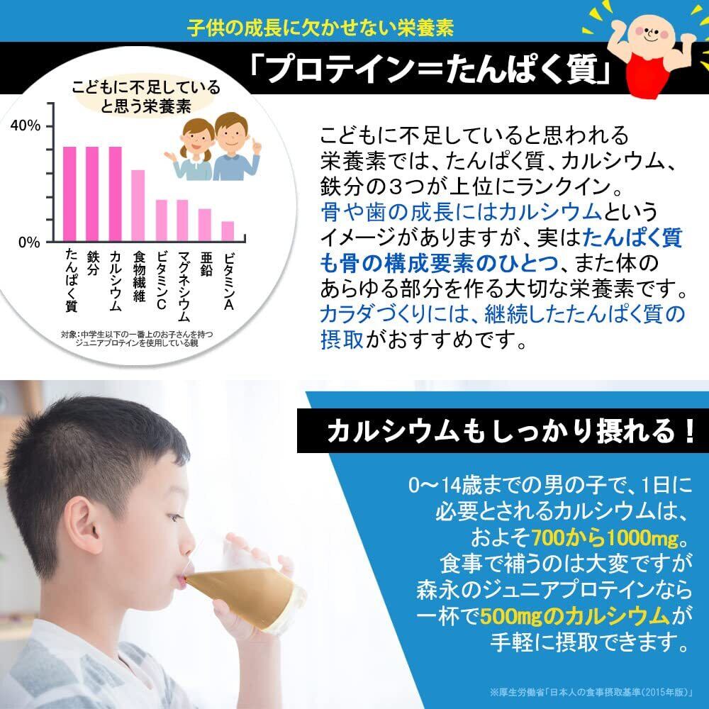 【スポーツ・勉強をがんばる成長期の栄養サポートに】「ウイダー ジュニアプロテイン」は、スポーツ・勉強をがんばる成長期のお子さまの栄養を支える補助食品です。●成長期の栄養サポートに必要な栄養素を豊富に配合成長期に必要な栄養素をしっかり補給。ウイダーのジュニアプロテインにはタンパク質はもとより、豊富なカルシウム、そのカルシウムの働きを助けるビタミンD、鉄分やビタミンB群といった栄養素まで幅広く配合されております。 特にカルシウムはお子様の成長のために豊富に配合。成長期のカラダづくりに役立ちます。●こどもの成長時にかかせない栄養素は「タンパク質・カルシウム」こどもに不足していると思われる栄養素にタンパク質・カルシウム・鉄分が上位にランクイン。骨の成長にはカルシウムというイメージがありますが、実はタンパク質も骨の構成要素の一つであり、タンパク質の摂取が成長をサポートします。●プロテイン=タンパク質タンパク質は、カラダのあらゆる部分のもとになる大切な栄養素。成長期のこどものカラダづくりのためにプロテインでおいしいタンパク質を補給しましょう。小中学生に適しています。●アイスでもホットでもウイダーのジュニアプロテインにはおいしい森永のココアを使用しています。お子様の飽きがこない味わいを実現しながらも、成長期のお子様にとって必要な栄養素をホットでもアイスでもおいしく手軽に摂取できます。合成甘