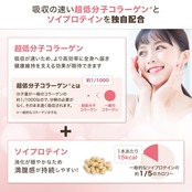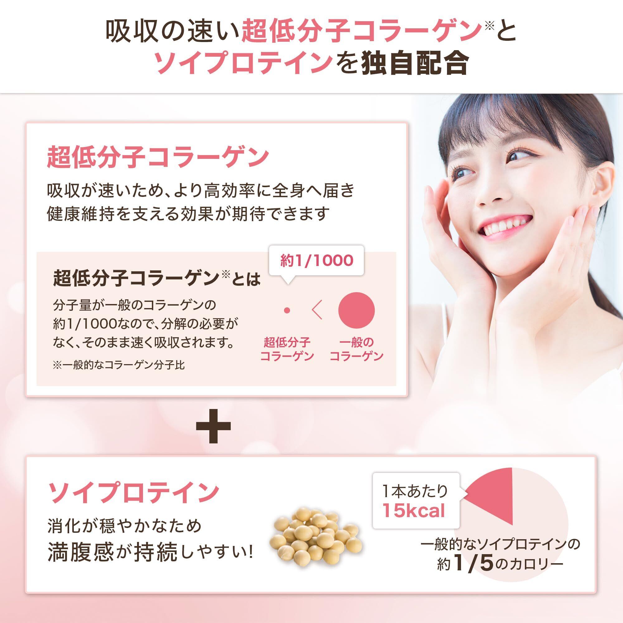 必須アミノ酸2700mgとソイプロテイン、一般的なコラーゲンより吸収の早い「超低分子コラーゲン」を配合。