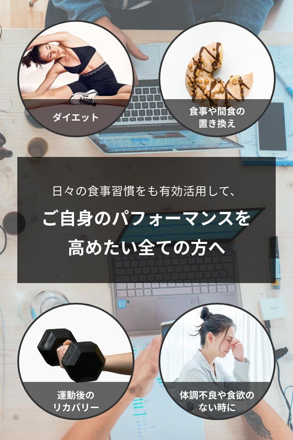 【特徴その④:炭水化物 10.8g (糖質4.8g、食物繊維5.8g)】糖質は主にデキストリンとパラチノースの組み合わせにより持続的なエネルギー補給を可能にし、合計4.8g供給(1食相当400kcalあたり)に抑えることで一日を通じての糖質摂取量の調整を容易にします。食物繊維はイヌリンとグァーガム分解物の組み合わせから合計5.8g(1食相当400kcalあたり)を供給します。