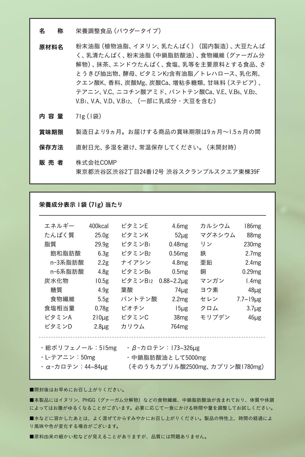 【製品紹介・栄養バランス】2015年設立、日本発の完全食・完全栄養食ブランドCOMPのパウダータイプ、糖質調整モデル(LC)の抹茶ミルク風味。「日本人の食事摂取基準(2020年版)」を参考に、三大栄養素(たんぱく質、脂質、炭水化物)の比率をカスタマイズし、食事における糖質摂取量の調整を容易にしました。また、ビタミン・ミネラル、食物繊維などもバランス良く含みます。 【風味・飲み方】香り豊かな抹茶パウダーをベースに、独自のフレーバリング技術を組み合わせることで、ほのかな甘みとミルクのコクが美味しい抹茶ミルク風味に仕上げました。400kcal(1袋/71g)に対して水250~300mlをしっかり混ぜてお召し上がりください。お好みに応じて、水の量を調整したり、牛乳・豆乳などの飲料を混ぜてお試しください。