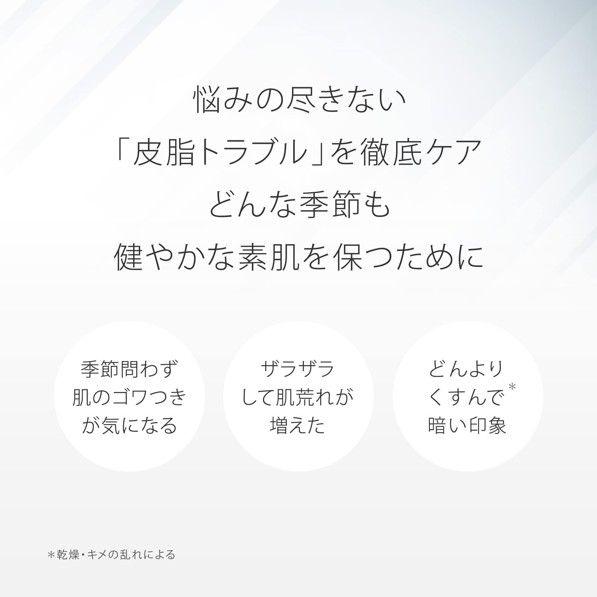 【アゼライン酸誘導体 2%配合】世界で幅広く使われており、穀物に含まれているため刺激が少ない成分であるアゼライン酸の誘導体を2%配合。ザラつき・ごわつきのない、なめらかな肌へ導きます。また、皮脂トラブルもケア。夕方になるとテカリやメイク崩れが気になる方、肌のベタつきが気になる男性の方にもおすすめです。