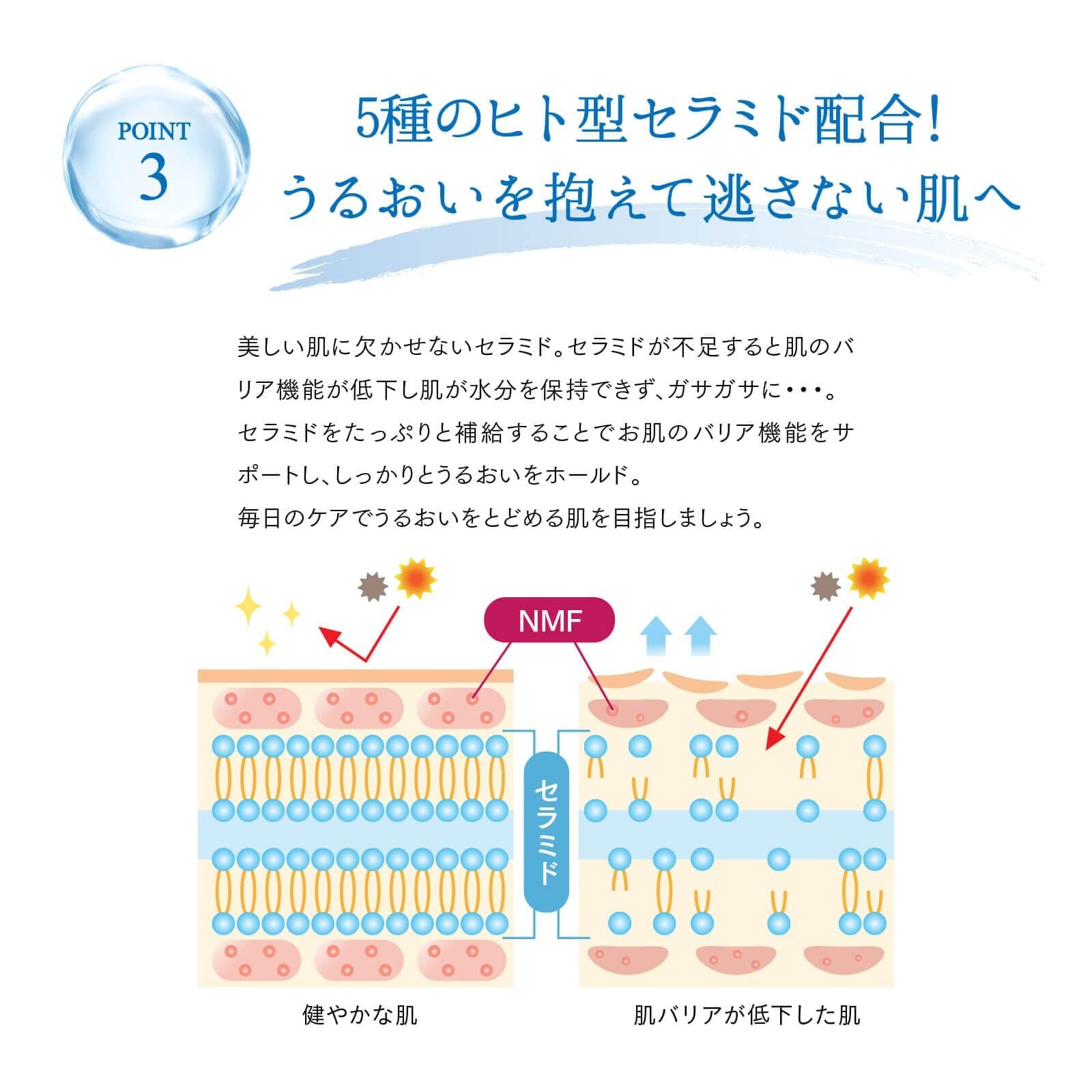 【機能性ヒアルロン酸を4種類配合】分子量も性質も異なる4種類の機能性ヒアルロン酸※1〜4を配合。それぞれが理想的なパフォーマンスを発揮し、肌へうるおいを送り込みます。※1:ヒアルロン酸ヒドロキシプロピルトリモニウム(保湿成分) ※2:加水分解ヒアルロン酸アルキル(C12-13)グリセリル(保湿成分) ※3:加水分解ヒアルロン酸(保湿成分) ※4:ヒアルロン酸Na(保湿成分)